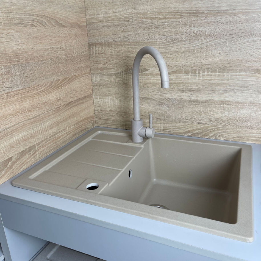 Мойка изготовлена из стойкого композитного материала и выдерживает температуру до 280С, не опасается кипятка, термических перепадов и активного ежедневного использования. Ее гладкая непористая поверхность не впитывает загрязнение и легко очищается, сохраняя первоначальный вид годами. Смеситель, входящий в набор, имеет поворотный излив на 360 градусов, что обеспечивает максимальную гибкость при мытье посуды и наполнении больших емкостей, а встроенный дозатор придает удобство и эстетическую завершенность рабочей зоны.