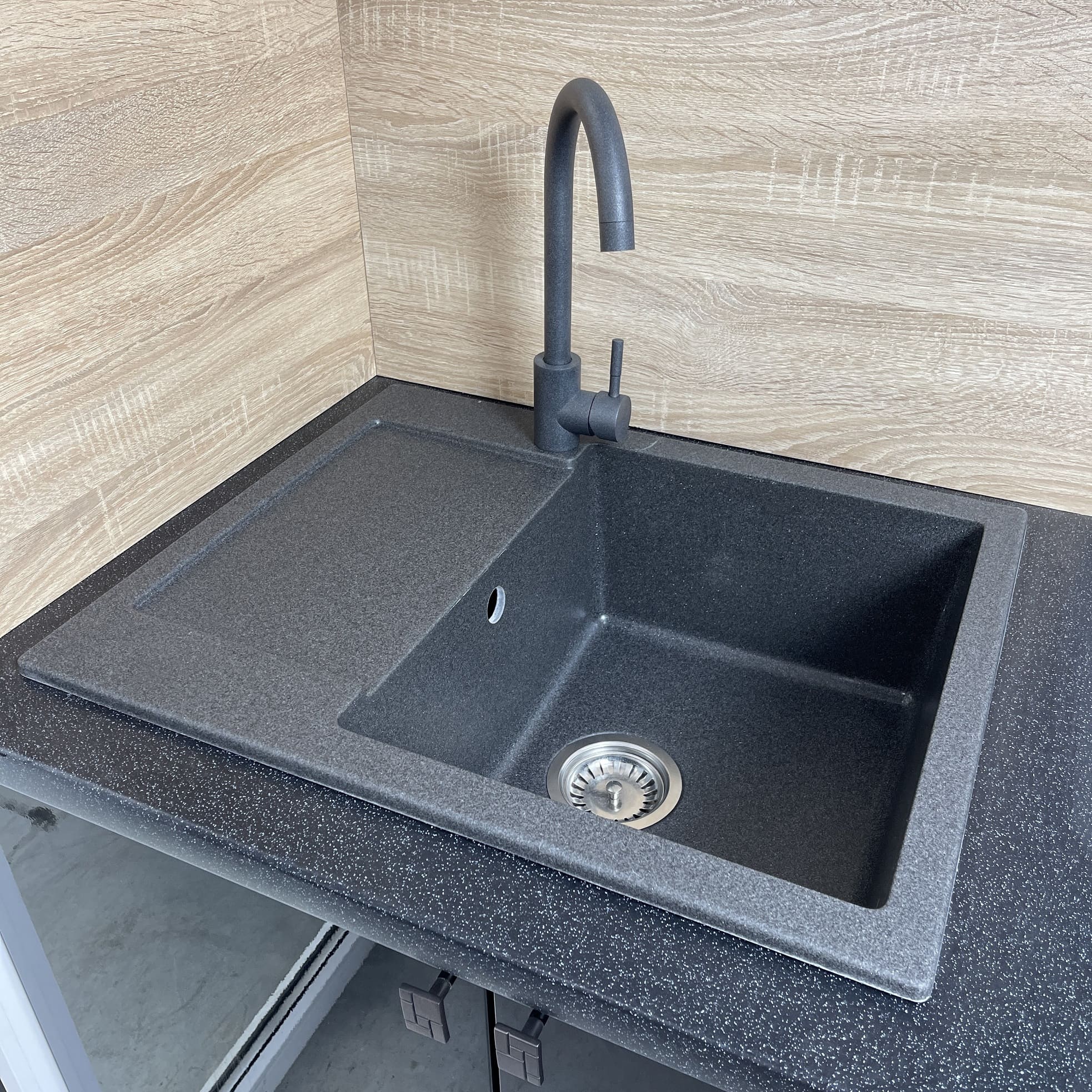 Мойка изготовлена из стойкого композитного материала и выдерживает температуру до 280С, не опасается кипятка, термических перепадов и активного ежедневного использования. Ее гладкая непористая поверхность не впитывает загрязнение и легко очищается, сохраняя первоначальный вид годами. Смеситель, входящий в набор, имеет поворотный излив на 360 градусов, что обеспечивает максимальную гибкость при мытье посуды и наполнении больших емкостей, а встроенный дозатор придает удобство и эстетическую завершенность рабочей зоны.
