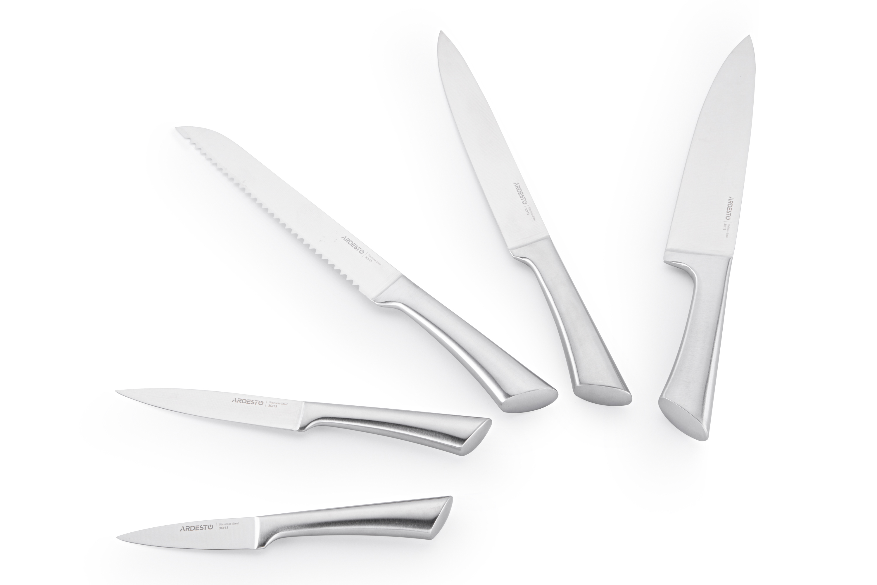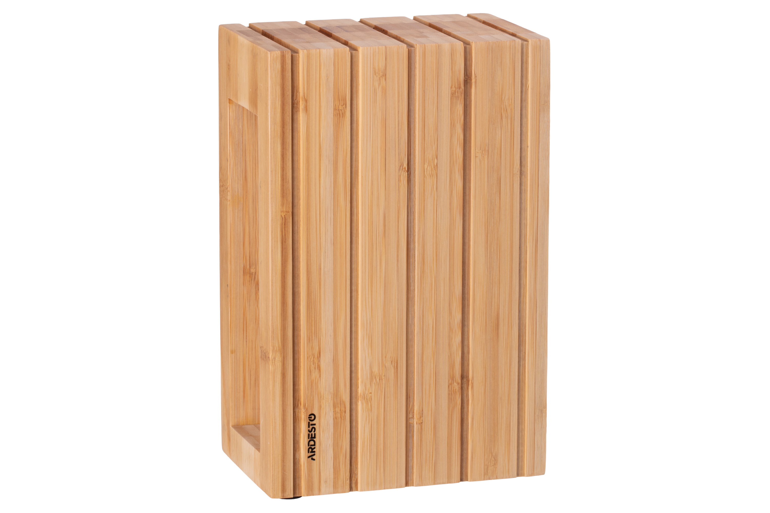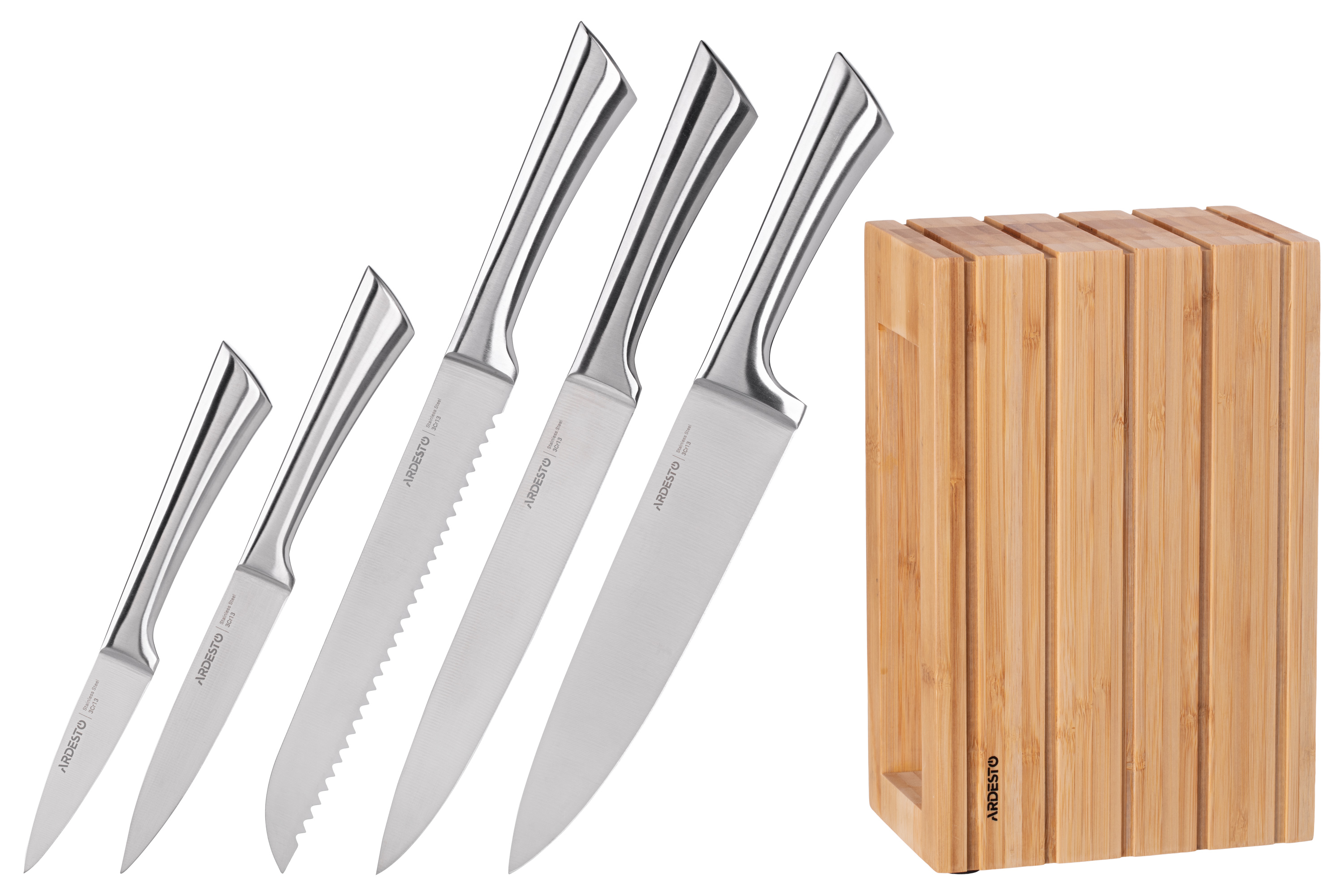 | Комплектация | 1 универсальный нож, 1 поварской, 1 для хлеба, 1 для овощей, нож-слайсер, бамбуковый блок |