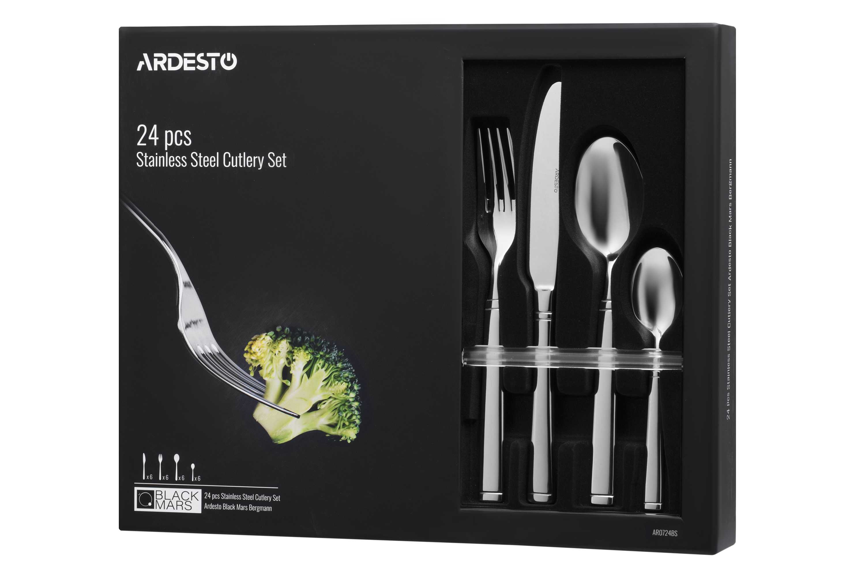 | Комплектация | Нож столовый, вилка столовая, ложка столовая, ложка чайная. На 6 персон, 24 предемета |