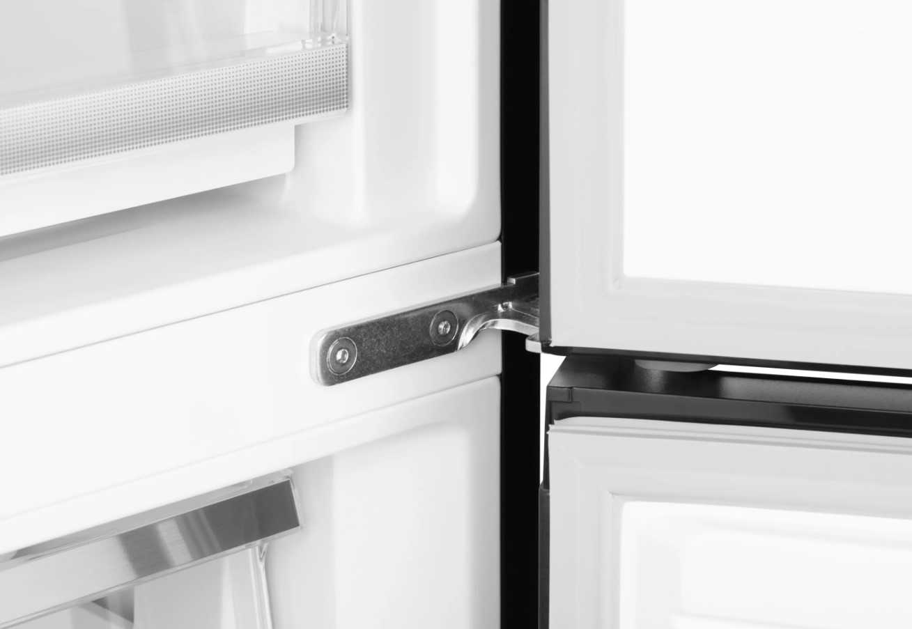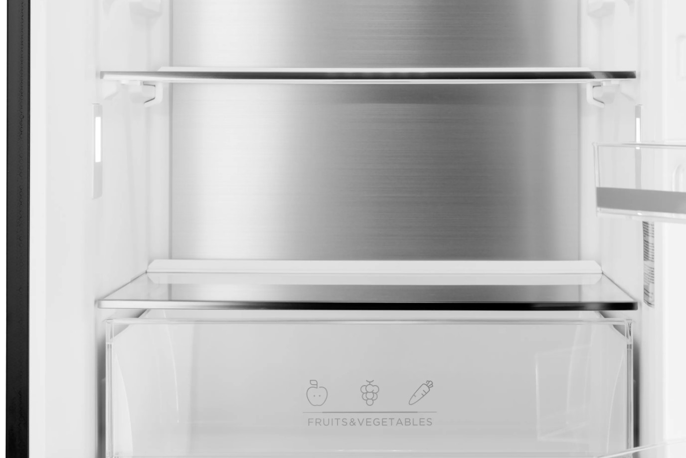 Стильный двухкамерный холодильник с фасадом из черной нерж. стали с нижней морозильной камерой. Возможность открывать дверь под углом 90 градусов позволяет размещать его вплотную к стене и не иметь при этом проблем с выдвижением ящиков. Кроме того, двери оснащены системой автоматической доводки.