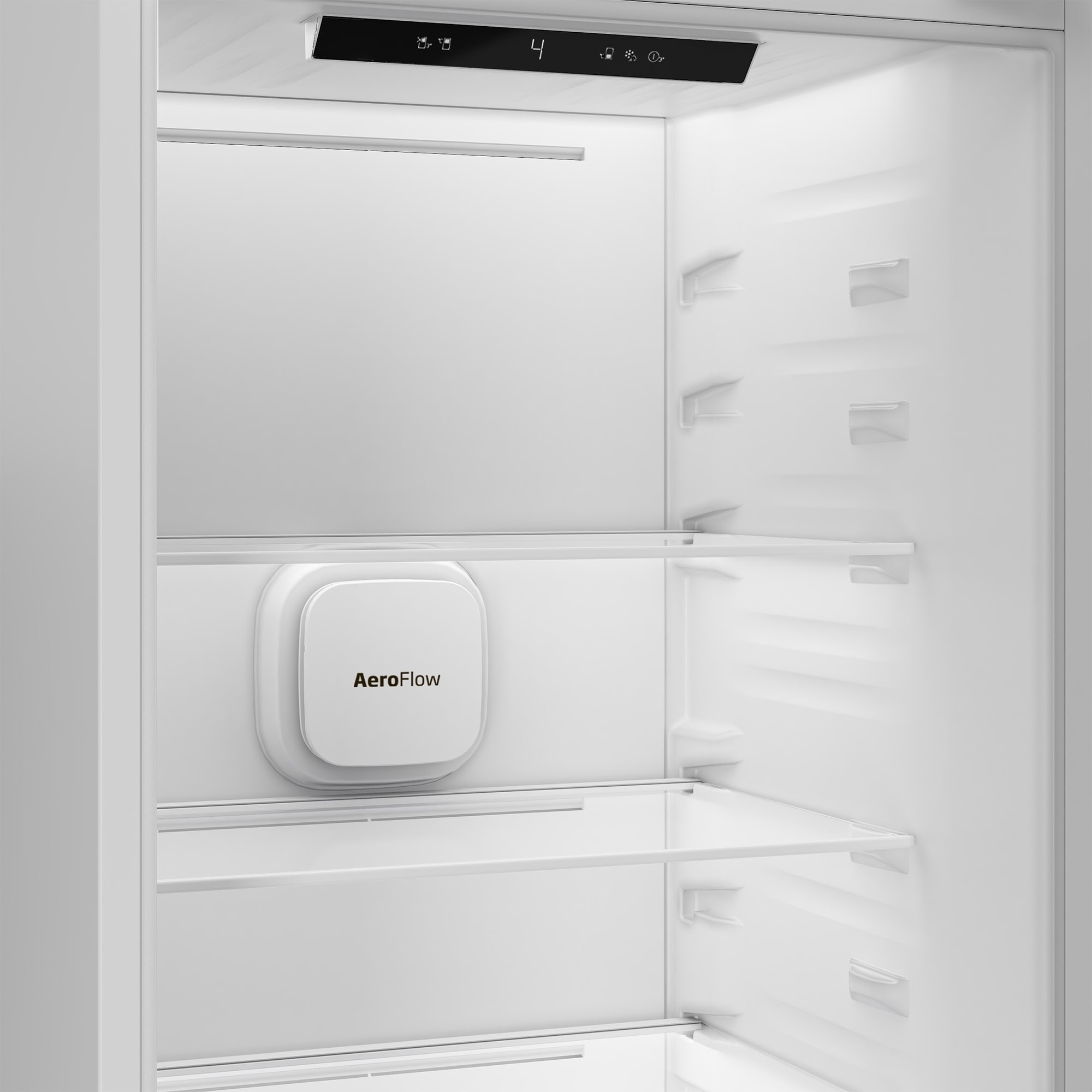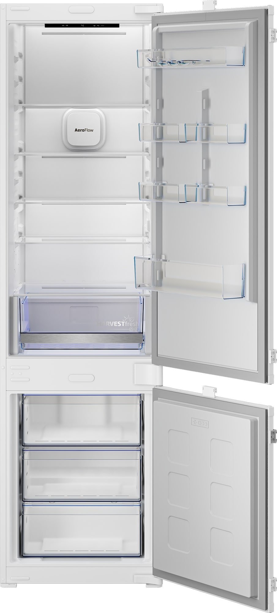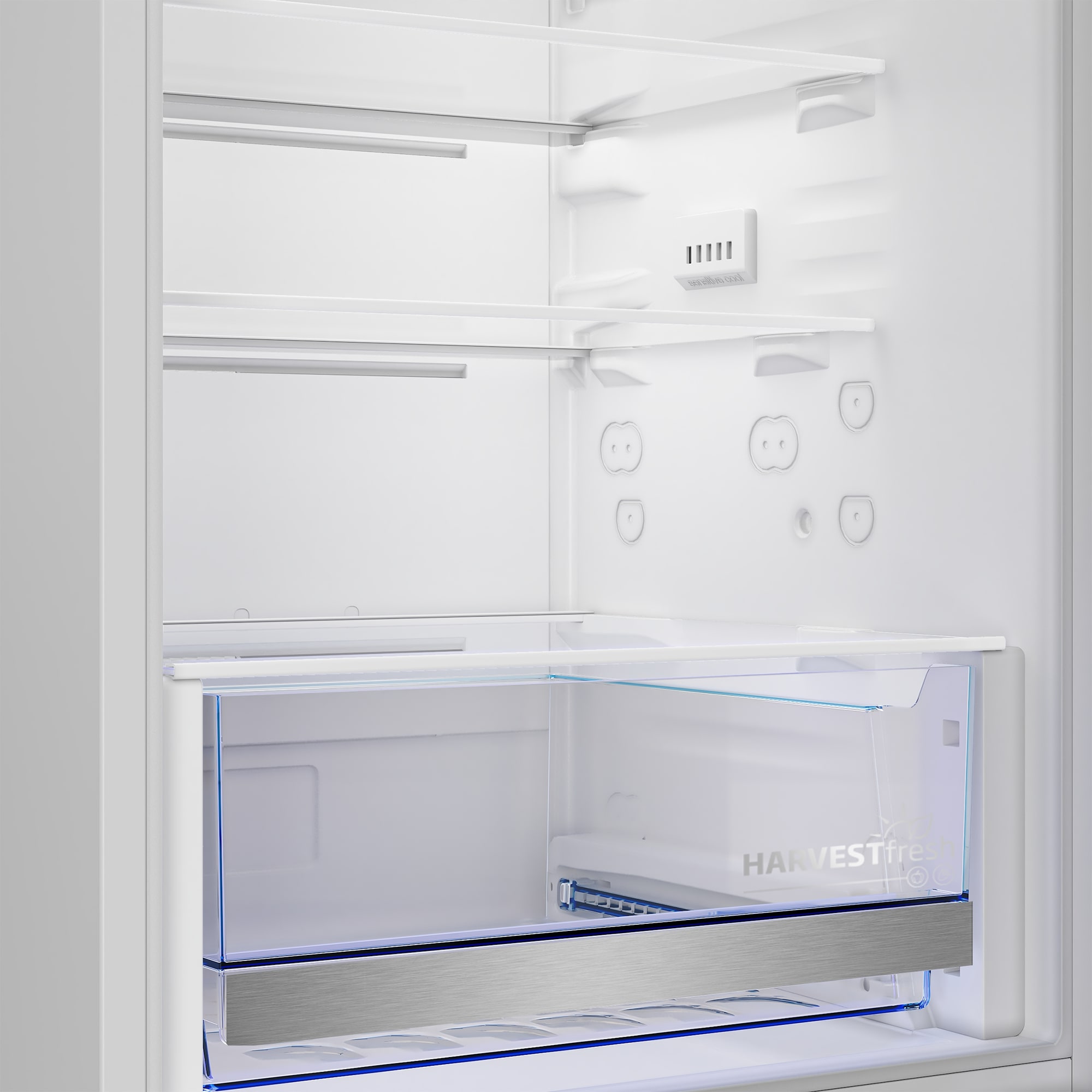 Встраиваемый холодильник Beko с нижней морозильной камерой рассчитан на ежедневное хранение продуктов в кухонных гарнитурах со встроенной техникой. Для овощей и фруктов предусмотрена технология HARVESTfresh, которая использует освещение трех цветов для имитации 24-часового солнечного цикла внутри холодильника. Это помогает дольше хранить витамины во время хранения. За эффективность охлаждения отвечает инверторный компрессор ProSmart, поддерживающий стабильную работу и работающий тише по сравнению с обычными компрессорами. Он реагирует быстрее на температурные колебания и помогает поддерживать заданные параметры в камерах. Для периодов длительного отсутствия предусмотрен режим отпуска. В этом режиме холодильная камера выключается, а морозильная камера остается включенной для хранения замороженных продуктов, что дает экономию электроэнергии. Полки из закаленного стекла выдерживают нагрузку до 25 кг и имеют повышенную стойкость к царапинам и трещинам по сравнению с обычным стеклом.