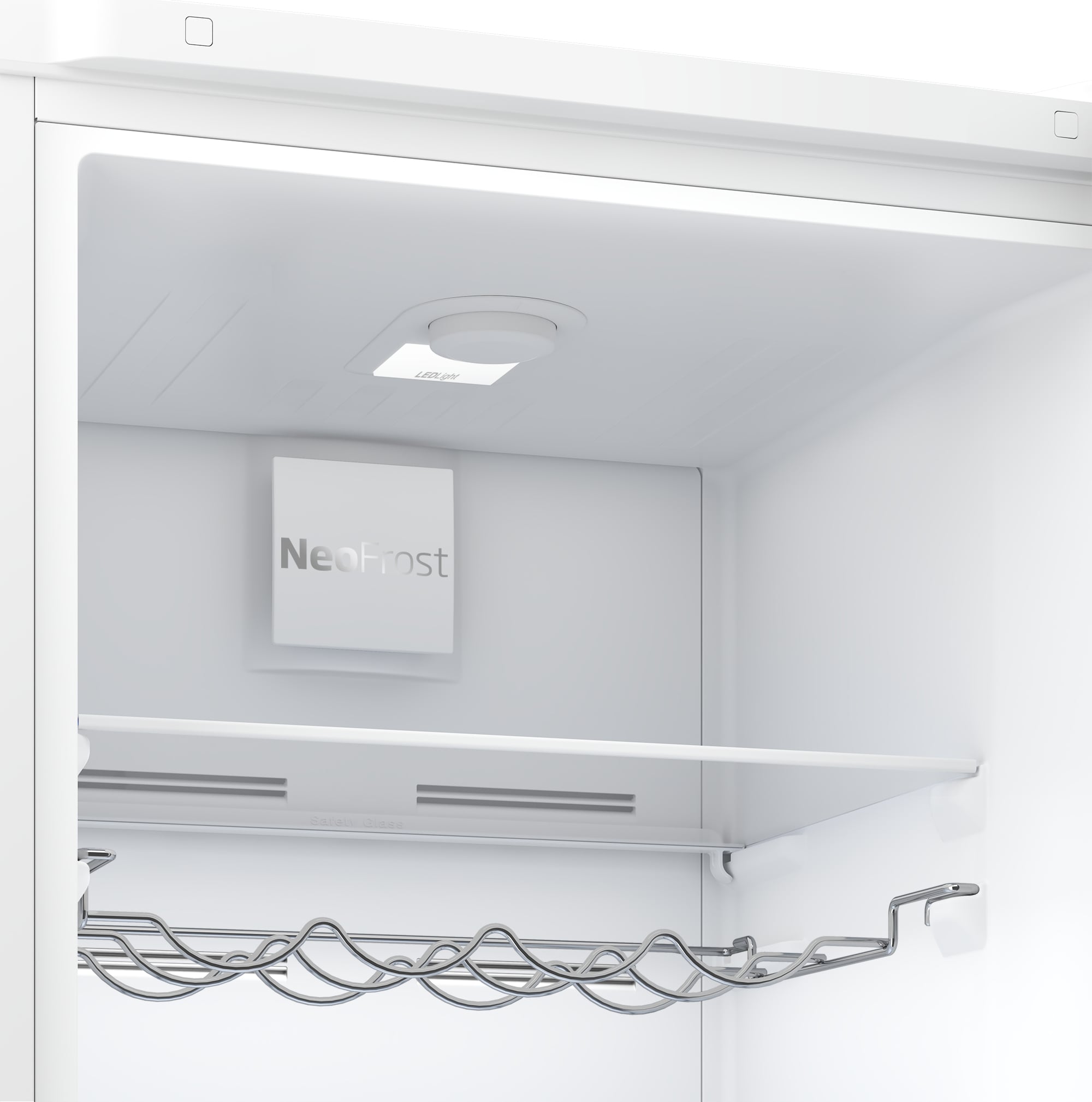 Холодильное отделение оборудовано полками из закаленного стекла, металлической винной полкой на всю ширину, нижним ящиком для овощей и фруктов и тремя дверными полками. LED освещение, расположенное на потолке, равномерно подсвечивает внутренний объем и обеспечивает четкую видимость продуктов. Управление производится механически и через сенсорные элементы. Морозильник имеет выдвижные ящики, форму Icebox и один лоток для льда. Функция быстрой заморозки помогает быстро обрабатывать свежие продукты.