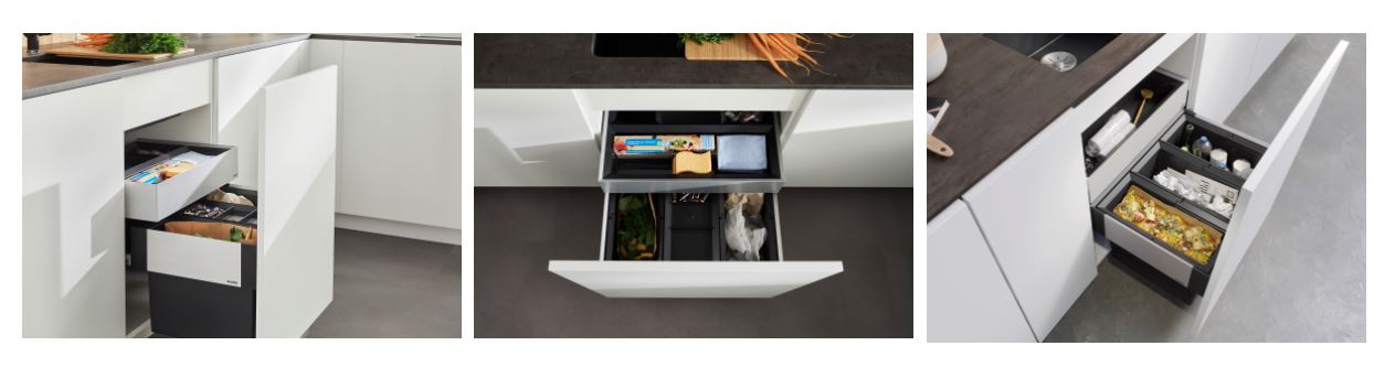 Полное использование пространства в шкафу под раковину благодаря подобранным по размерам решениям, гармонирующим с раковиной и смесителем.