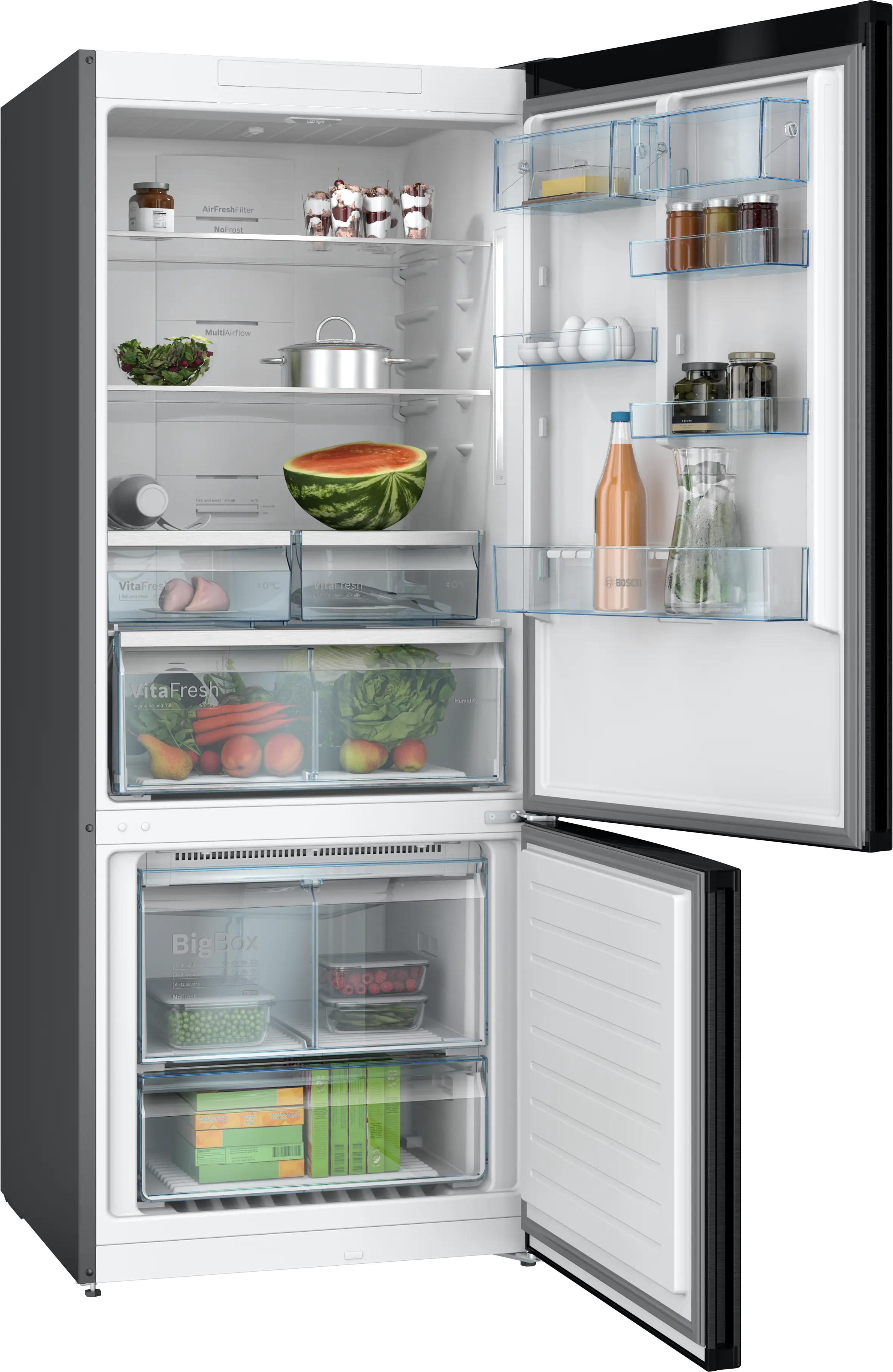 Bosch KGN76CXE0N – это отдельно стоящий холодильник с морозильной камерой снизу, сочетающий просторный объем, интеллектуальные технологии хранения и современный дизайн для комфортного ежедневного использования. Этот холодильник оснащен морозильной камерой снизу, что позволяет удобнее организовывать хранение свежих продуктов в верхней части и морозильных в нижней, обеспечивая легкий доступ к наиболее часто используемым продуктам.