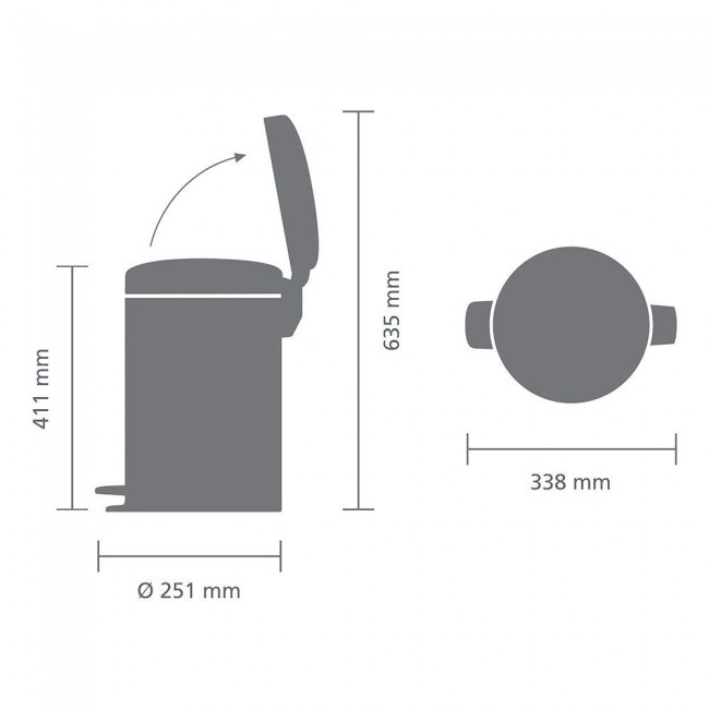 Мусорный бак Brabantia PEDAL BIN NEWICON 113741 бесшумный – плавное закрывание крышки и необыкновенно мягкий ход педали. Не пропускает запах – плотно прилегающая крышка. Устойчивый – специальное устройство, предотвращающее опрокидывание бака. Нескользящее основание. Удобная очистка – съемное внутреннее пластиковое ведро. Специальная ручка в блоке крепления крышки. В комплекте идеально подходящие по размеру мешки для мусора PerfectFit (размер C).