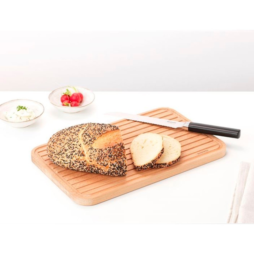 Идеальна для нарезки и подачи хлеба. Двустороннее изделие – для нарезки и подачи. Чистая столешница – глубокие желобки предотвращают вытекание сока. Стильный дизайн. Прочная – сделана из бука. С защитным масляным покрытием. Перед первым использованием и в дальнейшем регулярно обрабатывайте растительным маслом. Не погружайте изделие в воду и не оставляйте в мокром состоянии на длительное время. Мыть только вручную: очистка влажной тканью или щеткой.