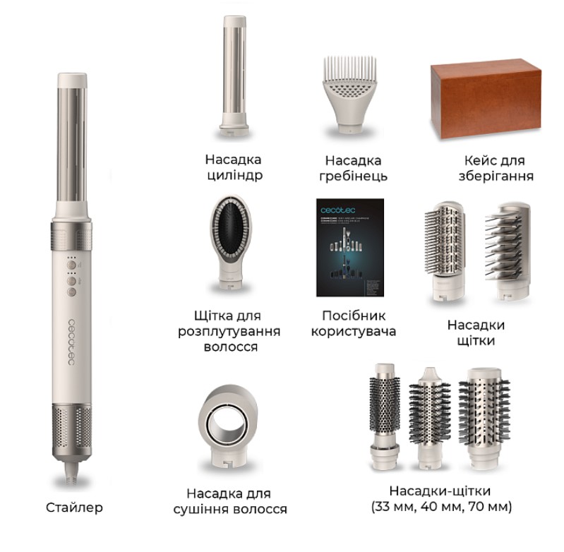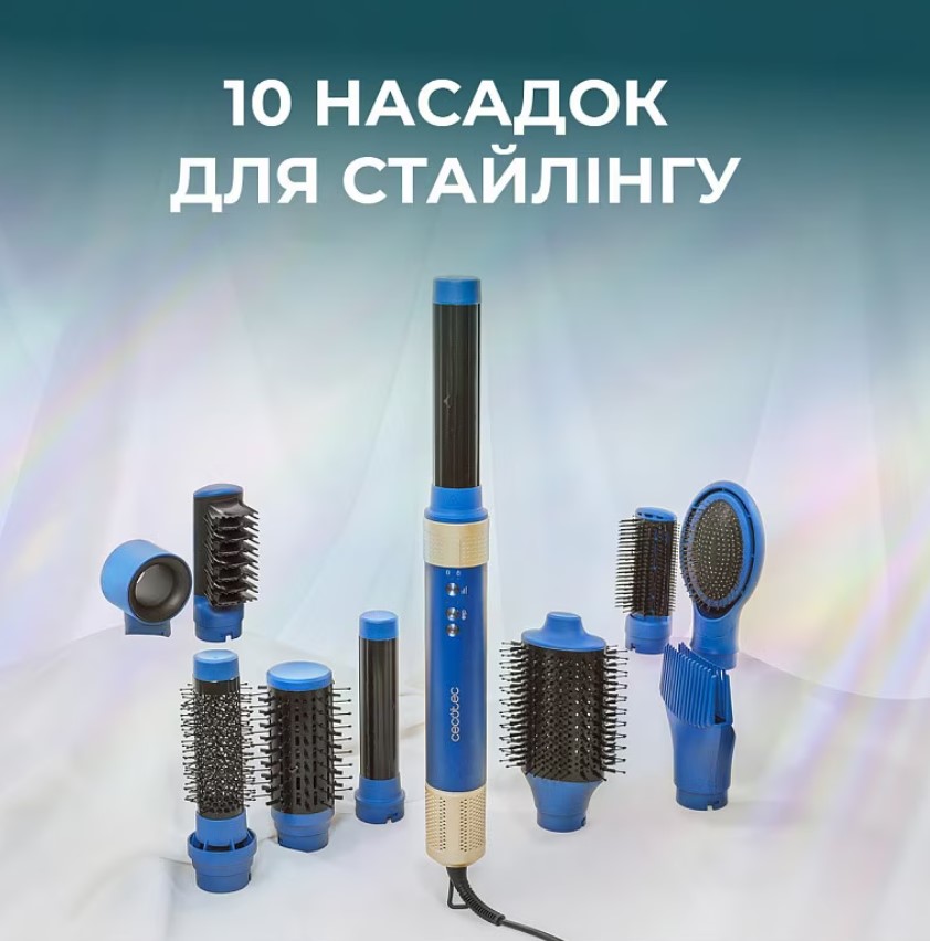 Модель комплектуется 10 насадками, что открывает полный спектр возможностей для стайлинга: от идеально гладкого выравнивания до объемных волн и локонов разного диаметра. Керамически-кератиновое покрытие обеспечивает равномерный нагрев и легкое скольжение по волосам, уменьшая риск пересушивания и ломкости. Функция ионизации нейтрализует статическое электричество, делая волосы более послушными, гладкими и блестящими, а также облегчает расчесывание после укладки.
