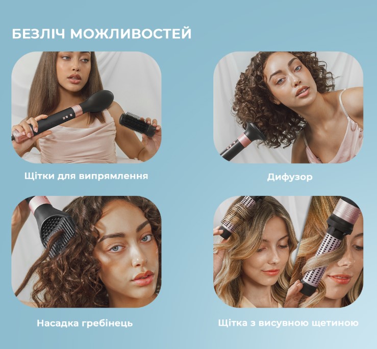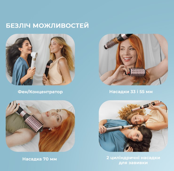 | Насадки | насадка кисть 3шт.(30мм, 40мм, 70мм), насадка гребень 2шт., насадка цилиндр 2шт., насадка концентратор, щипцы для завивки, насадка цилиндр с выдвижными зубьями, насадка диффузор, насадка щетка 2шт., насадка для сушки волос |
