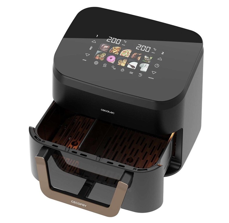 Техника 3D приготовления с двойным нагревательным элементом равномерно распределяет тепло, обеспечивая идеальные результаты при каждом приготовлении, без необходимости постоянно переворачивать пищу. Подвижный разделитель позволяет выбирать между приготовлением большого количества продуктов в корзине объемом до 11 л или меньшего количества в двух корзинах. Функция Sync позволяет обеим корзинам завершать приготовление одновременно с различными настройками, в то время как функция Match согласовывает температуру и время в обеих корзинах, обеспечивая равномерное приготовление и делая удобным приготовление большого количества продуктов.