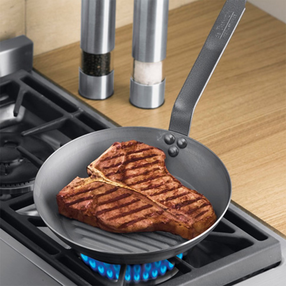 Сковорода-гриль De Buyer Carbone Plus (5530.26) станет отличным помощником как на профессиональной, так и на домашней кухне. Благодаря толщине стенок и дна тепло распределяется равномерно по всей поверхности изделия. Ручка прочно закреплена заклепками, ее удобно держать любой рукой. Плавные линии сковороды позволяют легко переворачивать блюда в сковороде, а также отправлять готовую пищу прямо в тарелку. Продукты в ней не подгорают и всегда приобретают красивый однородный цвет, при нагревании до температуры 145 Градусов можно достичь эффекта карамелизации.