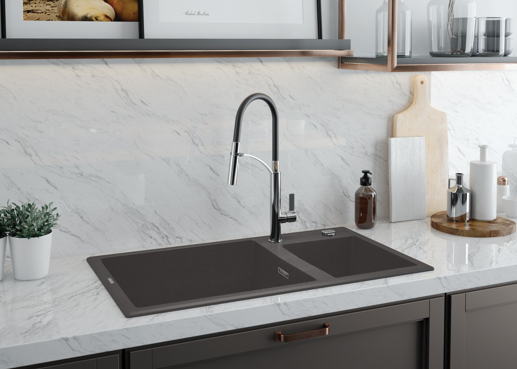 Смеситель оснащен двухфункциональной лейкой, которая позволяет переключать режим с аэрированной струи на дождевой душ. Эта вторая, идеально рассеянная струя идеально подходит для ополаскивания овощей, фруктов или уже вымытой посуды.