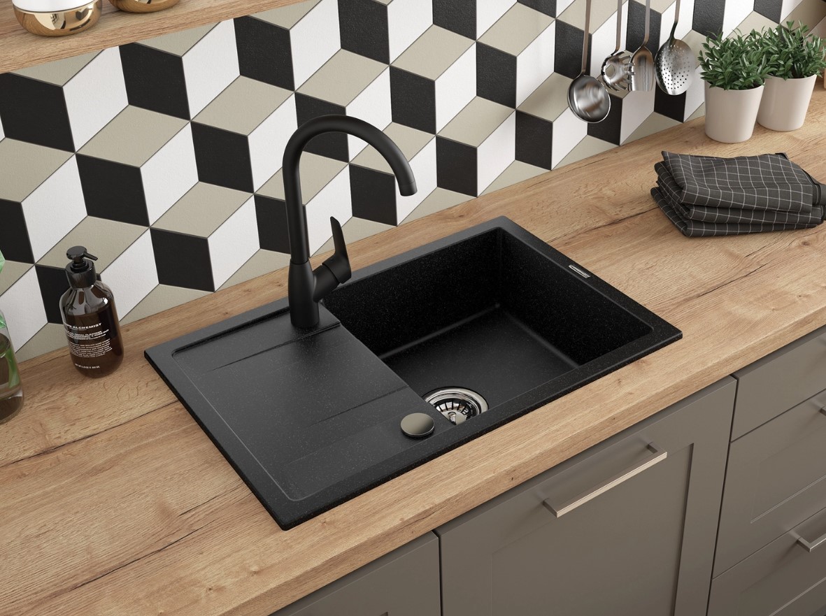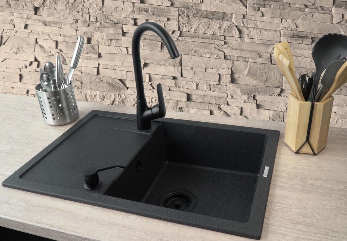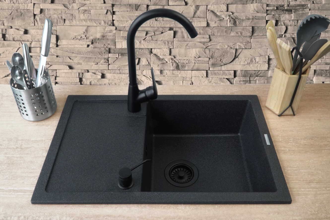 В комплект входит гранитная мойка с аксессуарами, кухонный смеситель и дозатор жидкости для мытья посуды. Покупая готовый набор, вы можете быть уверены, что все идеально сочетается друг с другом. Раковина изготовлена из прочного гранита, устойчивого к ударам и высоким температурам. Смеситель оснащен аэратором, аэрирующим струю воды, и поворотным изливом. Все это дополняется дозатором жидкости для мытья посуды. Смеситель и дозатор выполнены в элегантном черном матовом цвете и сочетаются с темной графитовой раковиной. Весь комплект удачно впишется в современную кухню, которая любит инновации и максимально использует пространство.