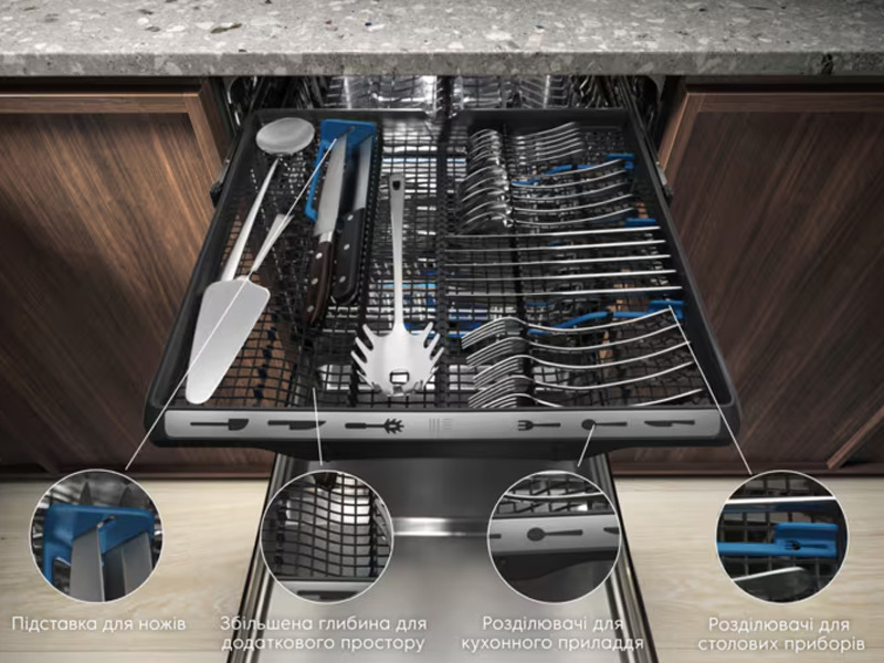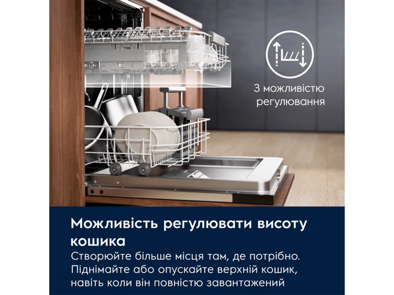 Встраиваемая посудомоечная машина Electrolux EEC67310L — современная модель шириной 60 см из серии 900 ComfortLift, которая сочетает в себе высокую эффективность мойки, интеллектуальные функции и удобство использования. Благодаря полностью встроенной конструкции посудомойка гармонично интегрируется в кухонный гарнитур и не нарушает дизайн интерьера. Емкость до 14 комплектов посуды позволяет легко справиться с мытьем посуды для большой семьи или после приема гостей. ComfortLift - первая поднимающаяся корзина. Благодаря нашей уникальной функции ComfortLift вам больше не придется наклоняться, чтобы загрузить или разгрузить посудомоечную машину. Легким нажатием ручки нижняя корзина плавно поднимается к вам. Мы первыми в мире сделали это для вашего удобства. Посудомойка оснащена системой сушки AirDry, которая автоматически открывает дверцу в конце цикла, обеспечивая естественную циркуляцию воздуха для более эффективной сушки. Интеллектуальная система QuickSelect позволяет легко выбрать продолжительность цикла и оптимальный режим мойки, а Beam on Floor проецирует световой индикатор на пол, показывая статус работы машины.