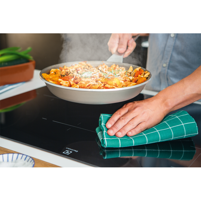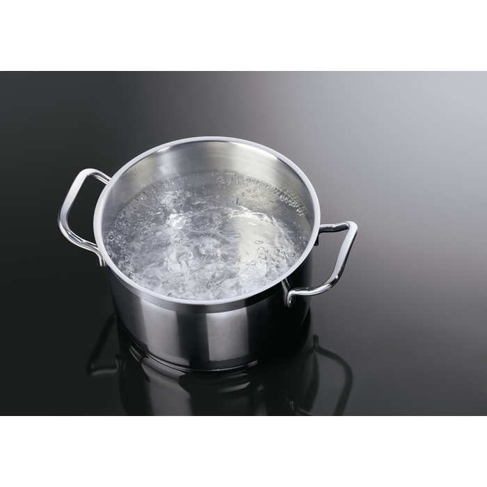 Благодаря профессиональной индукционной технологии этой плиты, ее поверхность никогда не достигает высоких температур. Поэтому разлитые блюда никогда не попадают, и пластина может быть очищена коротким вытиранием.