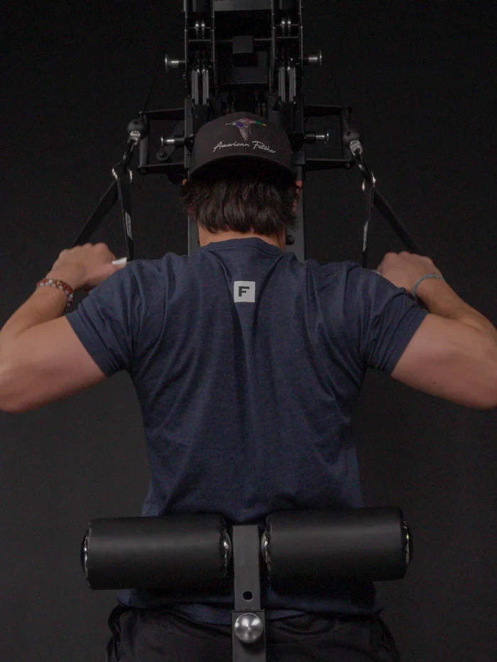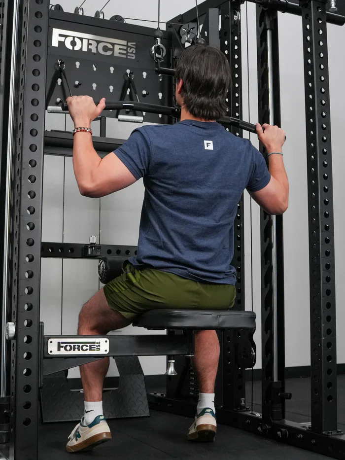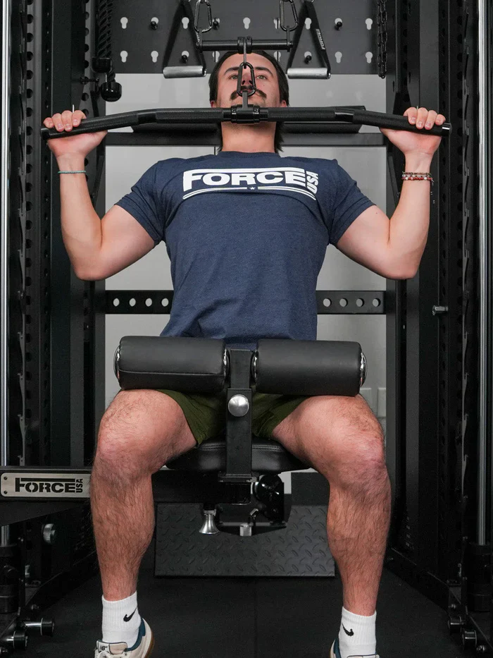 - Эргономичная опора для спины: установка на противоположную сторону обеспечивает поддержку поясницы при тренировке различных типов тяги сверху.