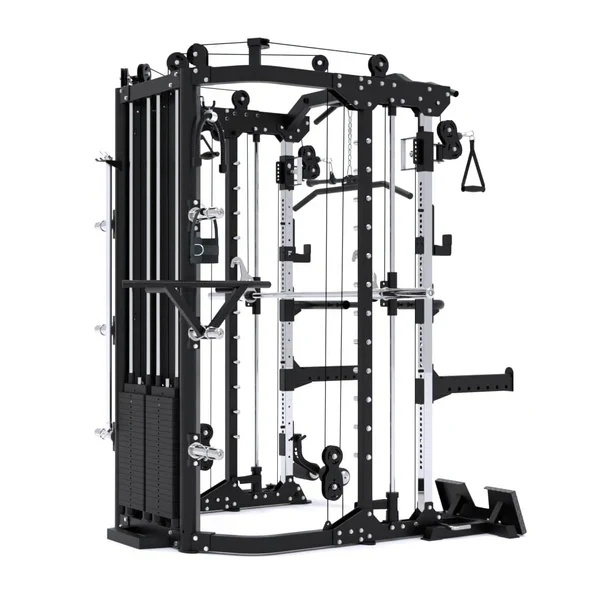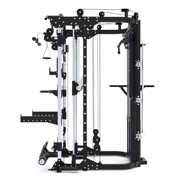 | Особенности | машина Смита с противовесом и плавным ходом для безопасного выполнения жимов и приседаний, многохватный турник с нагрузкой до 450 кг для подтягиваний в различных хватах, возможность выполнять свыше 70+ упражнений для всего тела, интегрированная тросовая система с уровнем контроля нагрузки 1:1, стационарные станции для жима J-крючки, платформы, канаты и т.д.) |