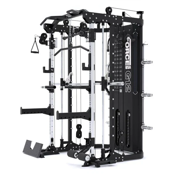 Force USA G12 – это многофункциональная силовая станция коммерческого класса с интегрированной машиной Смита с противовесом и силовой рамой для приседаний. Укомплектованная двумя грузоблоками по 100 кг (соотношение 1:1) эта станция обеспечивает исключительную плавность движения и стабильность во время выполнения упражнений. Станция разработана для достижения высоких результатов в силовом тренинге, реабилитации и функциональных нагрузках – идеальный выбор для профессиональных атлетов, тренеров и фитнес-студий.