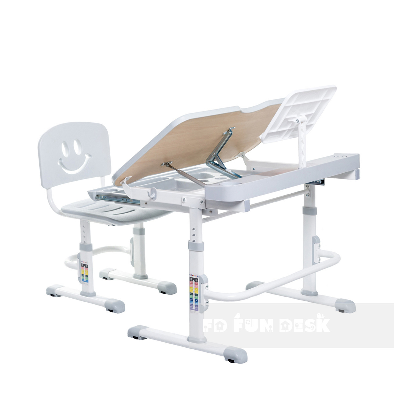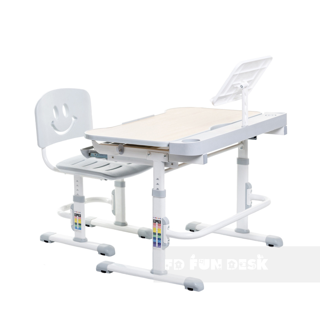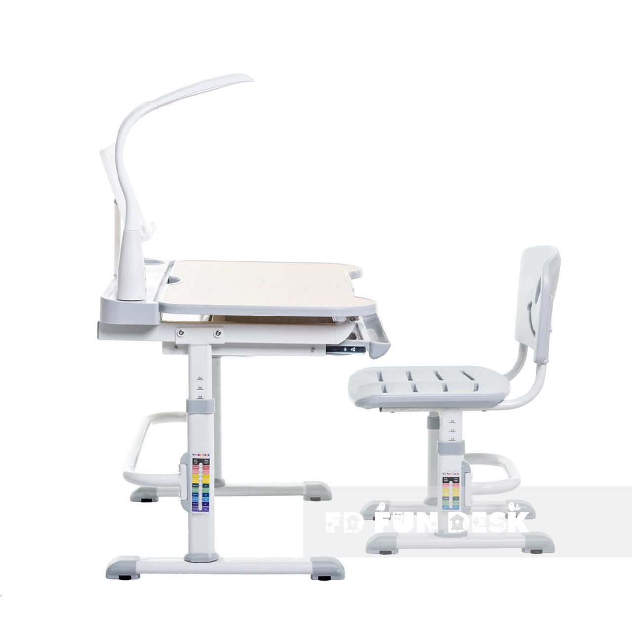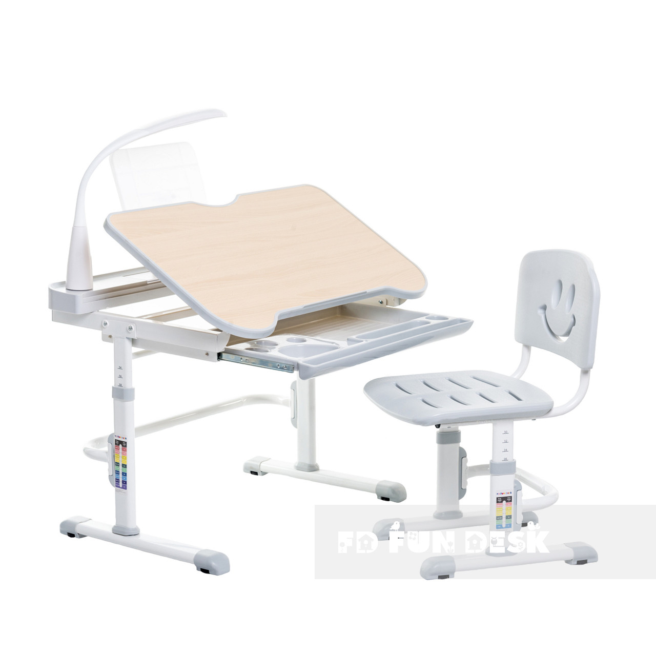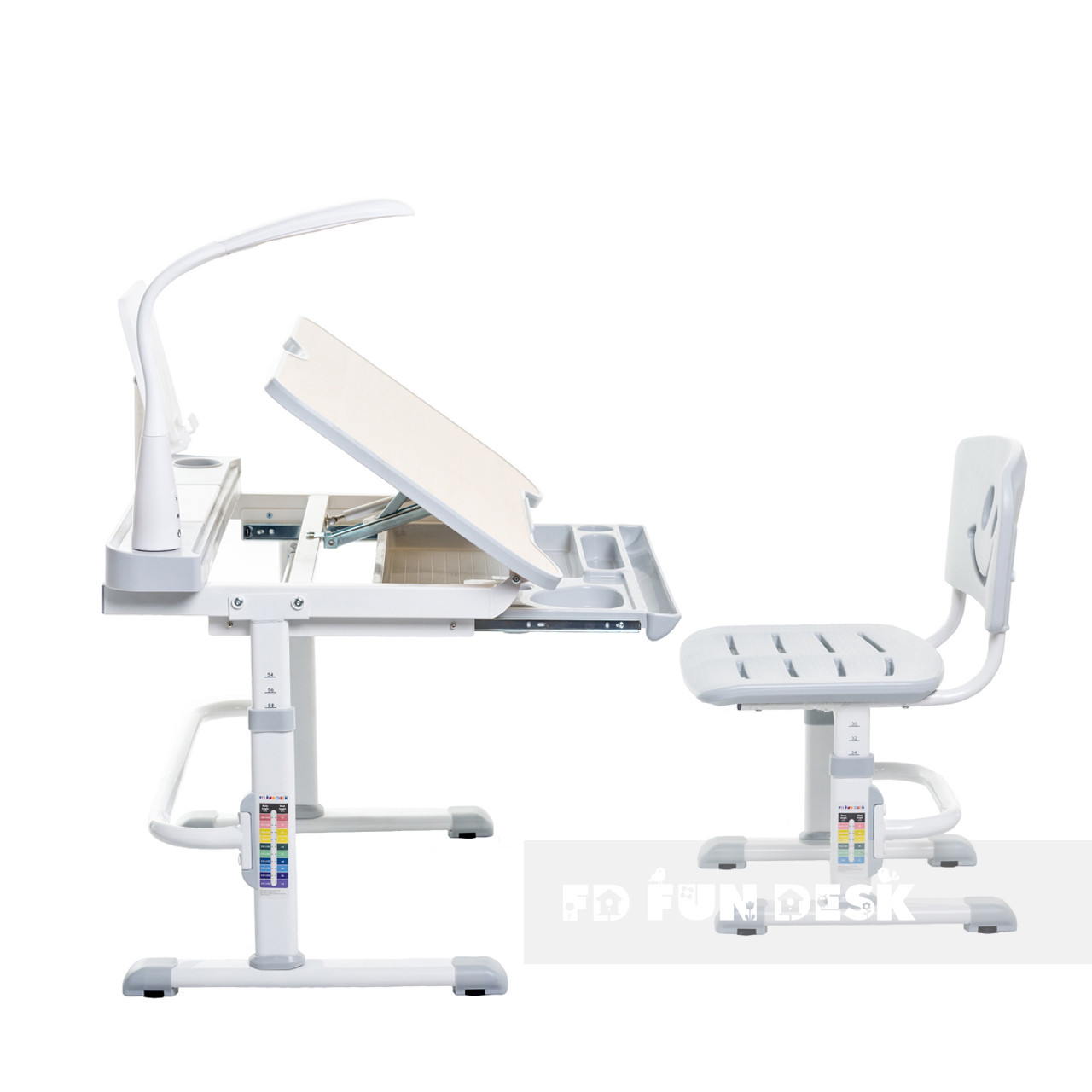 Комплект FunDesk Bellissima обеспечивает более комфортную среду обучения. Механизм регулировки высоты позволяет легко и быстро скорректировать стол и стул, что оптимально адаптирует его под соответствующий рост ребенка. Поверхность учебного стола имеет анти-бликовое покрытие и функцию наклона.Выдвижной ящик в нижней части стола предоставляет необходимое количество пространства для книг и канцелярских принадлежностей.