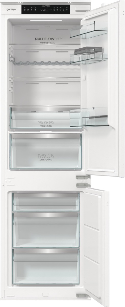 Gorenje NRKI517E61WF – это встроенный двухкамерный холодильник с нижним расположением морозильной камеры, сочетающий комфортную организацию пространства, интеллектуальные технологии охлаждения и современные функции, создавая удобный и эффективный бытовой прибор для вашей кухни. Холодильник оснащен системой NoFrost Plus, которая устраняет образование льда и инея в морозильной камере, а Multi Air Flow обеспечивает равномерное распределение холодного воздуха по всему объему, поддерживая стабильный микроклимат для продуктов.