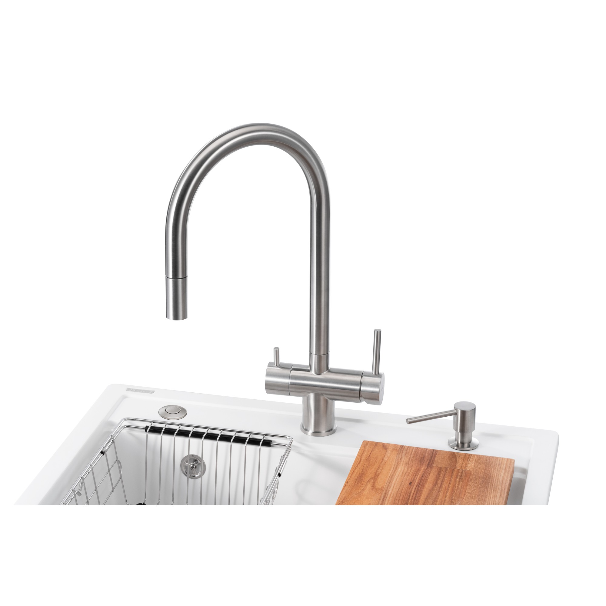 Благодаря смесителю GRANADO Ferrol с выдвижным изливом вы сможете ополаскивать посуду и мыть овощи в корзине, прицельно и экономно используя воду. Аэратор Neoperl будет дополнительно уменьшать расход воды, а керамический картридж Sedal и комплектующие премиум-качества обеспечат длительную эксплуатацию смесителя без нюансов. Еще одно преимущество GRANADO Ferrol – подключение и к общему водопроводу, и к фильтру для питьевой воды.