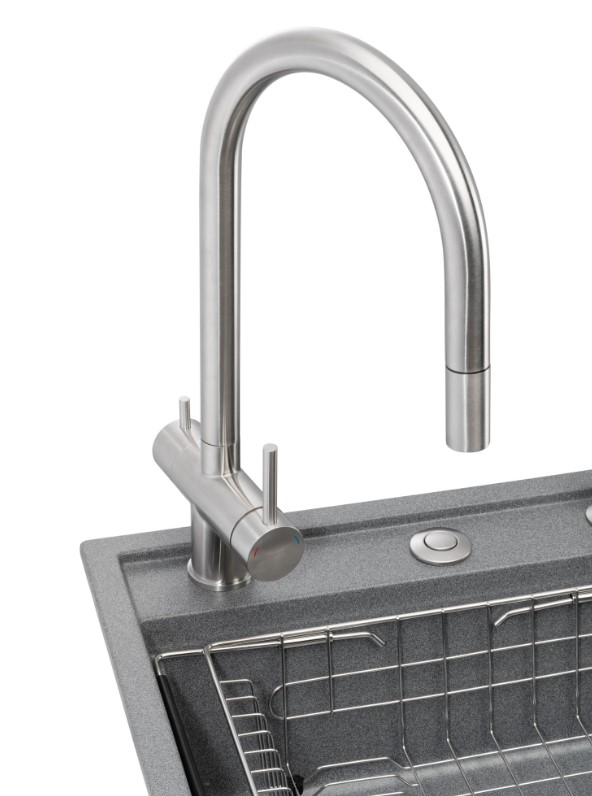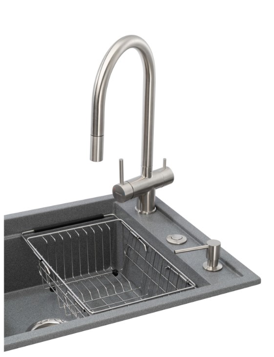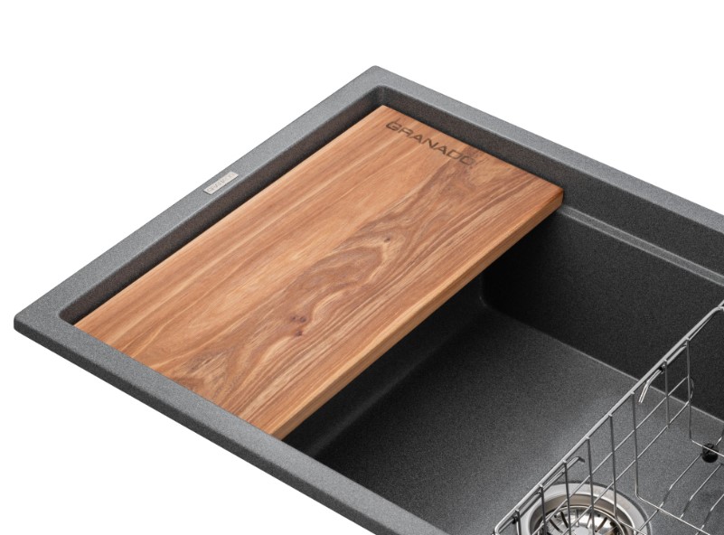 Кухонная станция GRANADO Royal – это роскошная находка для функциональной кухни! Мы позаботились о том, чтобы ваше пространство было бережно организовано, и пользование мойкой – максимально удобным. Собрали для вас в комплект мойку, измельчитель, смеситель, дозатор, металлическую корзину и кухонную доску. Кварцевая мойка GRANADO Estella – это уже пол пути к успеху. Модель размером 780х500 мм буквально предназначена для тумб шириной 800 мм. Просторная чаша обрамлена желобками и панелью для аксессуаров – все необходимое и ничего лишнего. Мойка изготовлена из немецкого кварцита премиального качества по нашей эксклюзивной технологии Nanogranite. GRANADO Estella выдерживает температуру до 260 градусов, устойчива к ультрафиолету и защищена от появления плесени. Достойная партия для этой мойки – смеситель GRANADO Ferrol. Выдвижной излив со шлангом 700 мм позволяет пользоваться водой со свободой движений. Фильтр грубой очистки воды, керамический картридж Sedal и утолщенный смесительный корпус обеспечивают его долговечность. Рядом со смесителем всегда под рукой у вас будет дозатор Redondo. Высотой всего 5 см над поверхностью, он не будет мешать вам в работе, позволит быстро и экономно набирать моющее средство одним нажатием. Между тем, емкость на 250 мл остается незаметной под столешницей. Мелкая посуда и приборы можно разместить в металлической корзине на мойке. Этот аксессуар отлично подойдет для мытья овощей или фруктов. Изюминка корзины – ее параметры: 350х245х120 мм, которые перестраиваются до размера 530х245х120 мм. Быстро почистить или порезать продукты вам будет удобно на разделочной доске GRANADO, изготовленной из натурального дерева. И все это — без лишних усилий и суеты, ведь пищевые отходы из мойки попадают в измельчитель Algar. Устройство вместо сифона соединяет мойку и канализацию, измельчая остатки пищи. И при этом имеет сниженный уровень шума – 30-40 дБ.