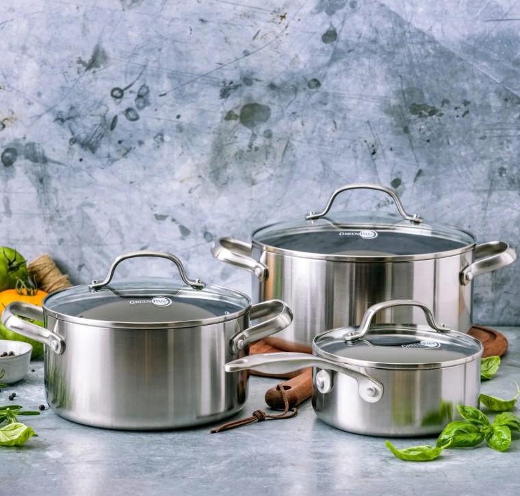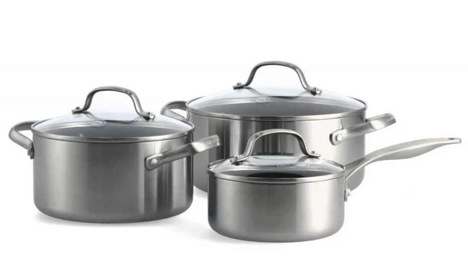 | Комплектация | 2 кастрюли с крышками, ковш с крышкой |