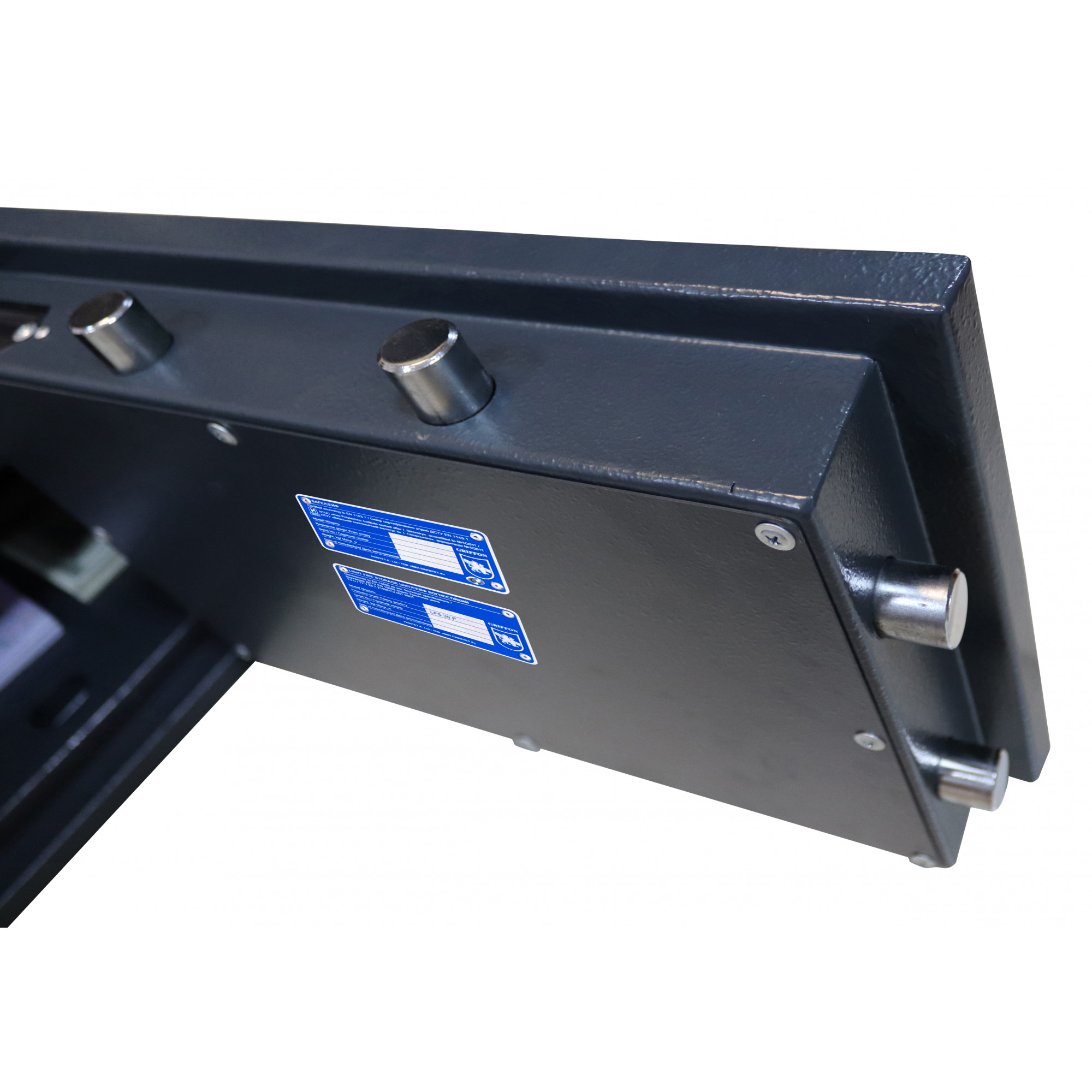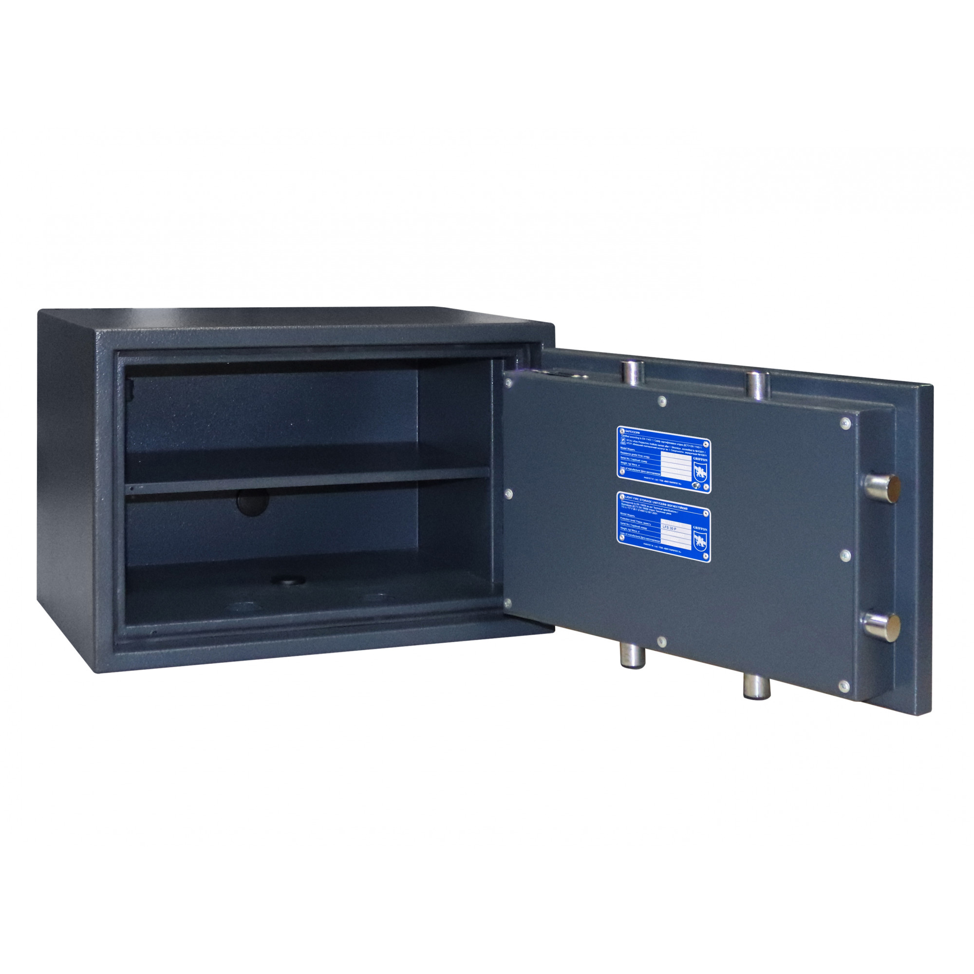 Огневзломостойкие сейфы TM Griffon серии CL II сертифицированы по второму классу сопротивления к взлому согласно ДСТУ EN 1143-1. Соответствуют классу огнестойкости LFS 30P ДСТУ EN 15659 и укомплектованы немецкой термолентой BASF. Ригельная система трехстороннего действия. Толщина защитного слоя корпуса и дверей со сверхпрочным бетоном – 40 мм. Стальные легированные пластины для защиты от высверливания и выбивания замков и ригелей.