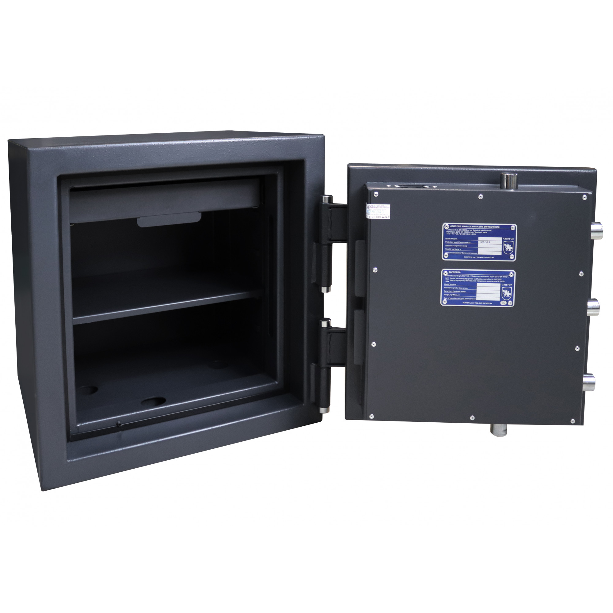 Огневзломостойкие сейфы TM Griffon серии CL II сертифицированы по второму классу сопротивления к взлому согласно ДСТУ EN 1143-1. Соответствуют классу огнестойкости LFS 30P ДСТУ EN 15659 и укомплектованы немецкой термолентой BASF. Ригельная система трехстороннего действия. Толщина защитного слоя корпуса и дверей со сверхпрочным бетоном – 40 мм. Стальные легированные пластины для защиты от высверливания и выбивания замков и ригелей. Ключевая особенность модели CL II.50.Е BOX – наличие выдвижного бокса для удобного хранения документов и ценностей.
