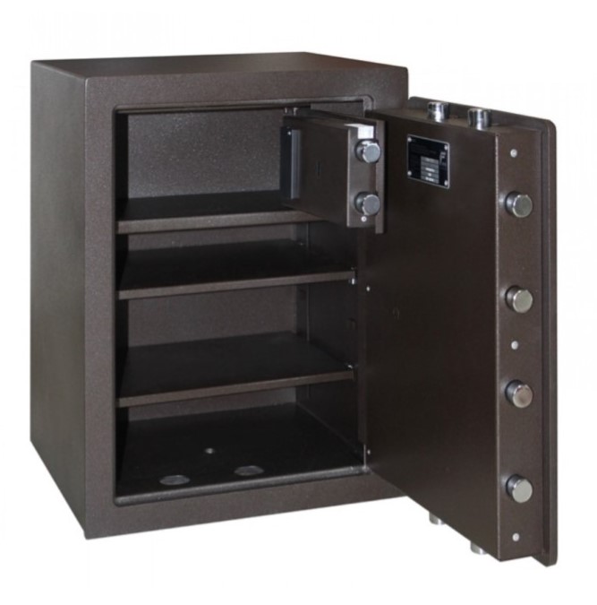 Сейфы CLE I сертифицированы в Германии Европейским органом сертификации ECB-S по I классу сопротивления к взлому по EN 1143-1, имеют защитный слой корпуса - фортификационный бетон толщиной 25 мм, и металлические двери толщиной 10 мм. Ключевые особенности CLE I.55.ET BROWN - оригинальный коричневый цвет покраски, наполнение стенок взломостойким бетоном, что позволяет во много раз увеличить степень безопасности и повысить уровень защищенности от возможного взлома, и трехсторонняя система запирания. Сейф взломостойкий CLE I.55.ET BROWN оснащен стальными легированными пластинами для защиты от высверливания и выбивания замков и ригелей, укомплектован сертифицированным сейфовым замком STUV SWINGLOX/M-LOCKS, имеет трейзер с електронным замком GRIFFON 2.0.