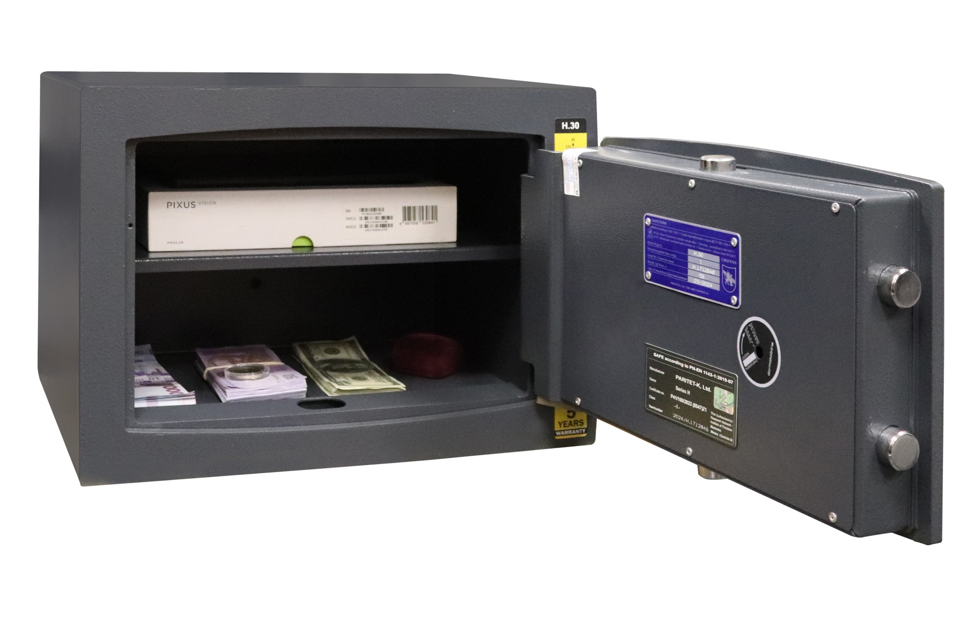 Сейфы серии Н сертифицированы по I классу сопротивления к излому по EN 1143-1 и имеют защитный слой корпуса – фортификационный бетон толщиной 25 мм, и металлические двери толщиной 14 мм. Данная конструкция позволяет многократно увеличить степень безопасности и повысить уровень защищенности от возможного излома. Сейф взломостойкий H.30.C укомплектован сертифицированным кодовым механическим замком LaGard (США) класса VDS 1.