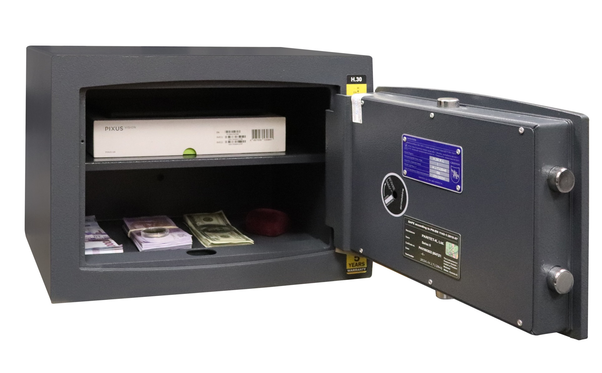 Сейфы серии Н сертифицированы по I классу сопротивления к излому по EN 1143-1 и имеют защитный слой корпуса – фортификационный бетон толщиной 25 мм, и металлические двери толщиной 14 мм. Данная конструкция позволяет многократно увеличить степень безопасности и повысить уровень защищенности от возможного излома. Сейф взломостойкий H.30.K.C укомплектован ключевым замком STUV и механическим кодовым замком LaGard (США) класса VDS 1.