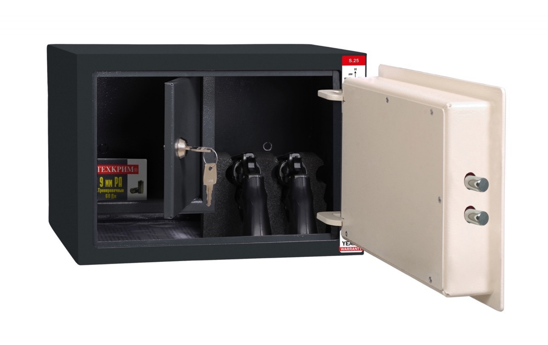Сейфдля пистолетов TM Griffon серии S – оптимальный и надежный вариант для хранения пистолетов. Сейф имеет отдельный запираемый отсек для боеприпасов (трейзер) и ложемент под пистолет. Сейф подходит для хранения ценностей и документов. В перечне основных преимуществ этой продукции: толщина металлических дверей – 3 мм, сейфы оборудованы парой стальных вращающихся ригелей.