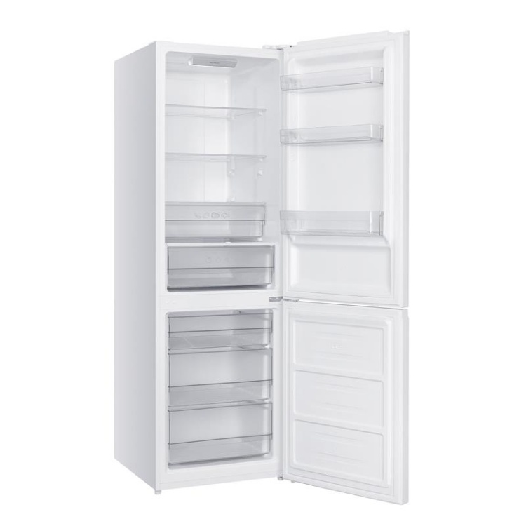 Grifon NFND-186/402W — двухкамерный холодильник с нижней морозильной камерой, который подходит для средних и больших кухонь с необходимостью хранить много продуктов. Модель имеет общий полезный объем около 400 л – это дает достаточно места для больших пакетов и сезонных запасов. Система No Frost работает и в холодильной, и в морозильной камере, поэтому нет необходимости вручную размораживать отделения, что значительно повышает удобство в повседневном использовании.