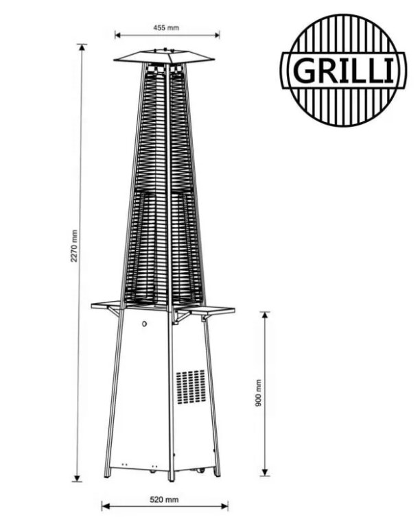 В холодное время года досуг на открытом воздухе становится некомфортным. Решить это неудобство позволит газовый обогреватель Pyramide ТМ GRILLI. Исполнение в классическом дизайне с использованием качественных материалов делает это обогреватель идеальным для обогрева. Горящее пламя в колбе создает прекрасный визуальный эффект, а также обогревает окружающее пространство. Для более качественного отражения и рассеивания тепла используется крышка-отражатель из нержавеющей стали. Таким образом, Pyramide ТМ GRILLI способна эффективно обогреть пространство. Стеклянная колба имеет защиту в виде металлической решетки, которая является препятствием для механических повреждений, а также непреднамеренным ожогам. Максимальная мощность отопителя 13 кВт. А время непрерывной работы отопителя, от одной заправки двадцати семилитрового баллона, составит около 12-40 часов, в зависимости от выбранного режима нагрева. Нижняя часть обогревателя, это легко открывающаяся тумба, где устанавливается баллон с газом. Наличие 4х ножек гарантирует стойкость, при которой его сложно перевернуть. Газовый обогреватель Pyramide ТМ GRILLI – это отличный способ обогрева прохладными летними вечерами, а также зимой при минусовой температуре. Также, визуальный эффект и стойкость излучаемого тепла, по достоинству оценят и посетители кафе, ресторанов, уличных площадок.... Конструкция продумана до мелочей и гарантирует простоту эксплуатации устройства!