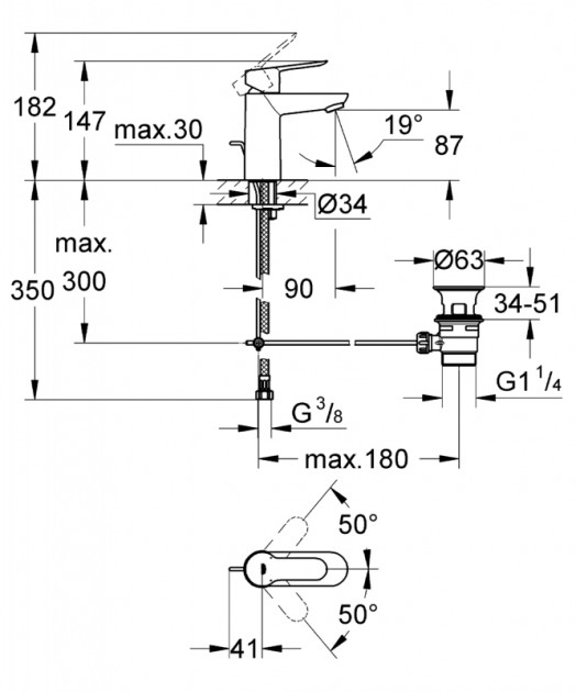 Смеситель для ванны Grohe 23328000 BauEdge OHM basin (pop-up waste) с технологией совершенного потока при уменьшенном расходе воды