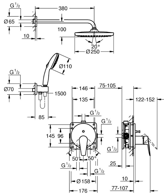 | Комплектация | верхний душ, кронштейн, ручной душ, душевой шланг, смеситель |