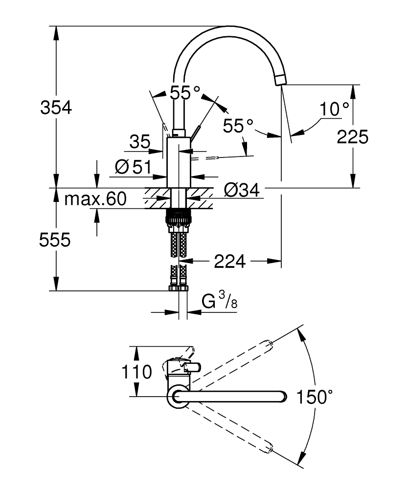| Особенности | выбираемый диапазон поворота: 0/150 градусов, гибкие соединительные шланги |