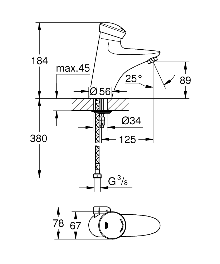 | Особенности | 6V литиевая батарейка, тип CR-P2. Гибкая подводка. Обратный клапан со встроенными фильтрами. Система быстрого монтажа. Прерывание подачи воды старт/стоп. Автоматическое отключение воды. Автоматическое безопасное отключение воды после 180 сек. непрерывного пользования (заводская настройка). Активизация включения. Безступечатая настройка продолжительности подачи воды от 2 до 180 сек. Автоматический смыв 5 мин после 3-х дней не пользования. Модуль термической дезинфекции 3,5 –11 мин. Одобрено в СE тип защиты смесителя IP 59K. Минимальное давление 1.0 бар. |