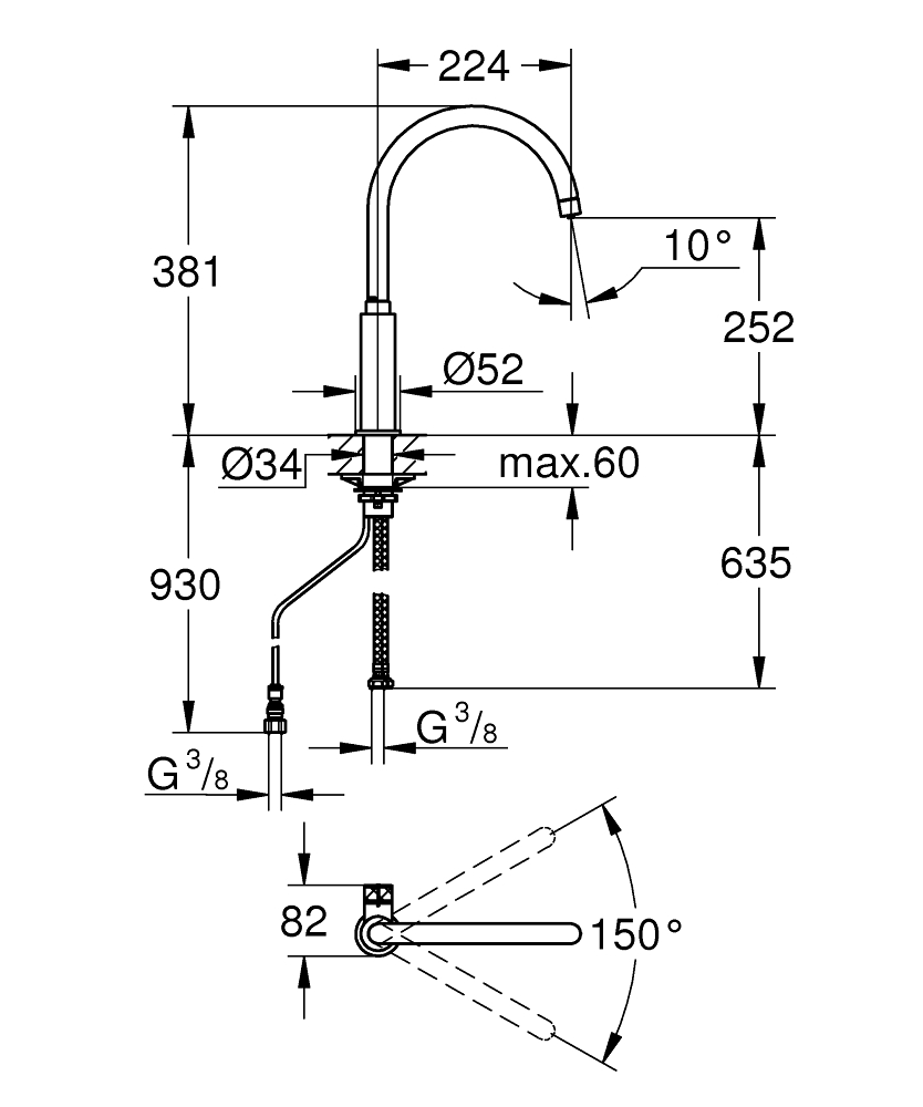 | Особенности | Область поворота 150°. Гибкая подводка. Монтаж на одно отверстие. C-излив. Рукоятка для фильтрованной воды. |