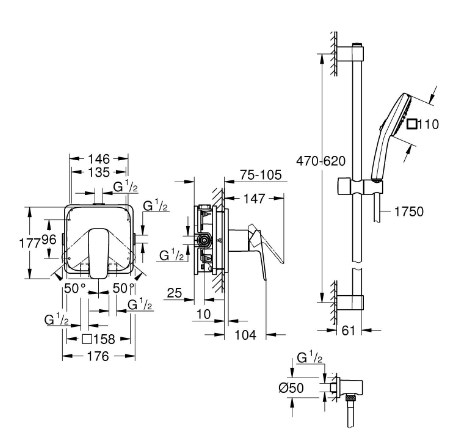 | Комплектация | смеситель, ручной душ, душевая штанга, душевой шланг |