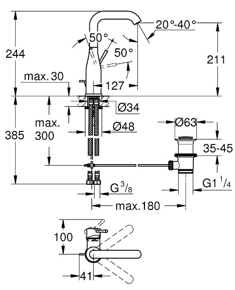 GROHE Water Saving – технология непревзойденного потока при экономном использовании воды. GROHE AquaGuid является регулируемым аэратором. GROHE FastFixation Plus - система быстрого монтажа. Вращающийся излив с аэратором и стопором, регулируемая плоскость вращения 0 / 150/ 360 градусов