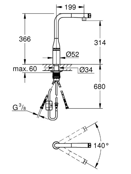 | Особенности | угол вращения излива 140 градусов, технология магнитной стыковки |