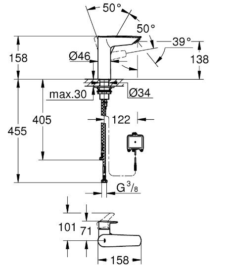 С инфракрасным датчиком для двусторонней связи для мониторинга, настройки и сервисного обслуживания. Обратный клапан, фильтр для задержания грязи, со встроенным соленоидным клапаном, многоуровневый указатель состояния батареи, 7 предварительно установленных программ: автоматическое смывание. режим мойки, дополнительные функции и точные настройки с помощью пульта дистанционного управления. GROHE Water Saving – технология непревзойденного потока при экономном использовании воды