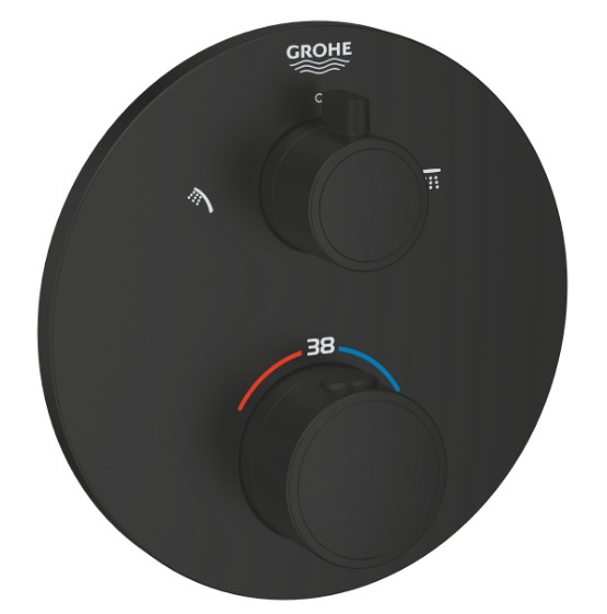 Этот матово-черный термостатический смеситель для душа GROHE Grohtherm станет идеальным завершающим элементом для вашего душа, позволяя вам легко переключаться между верхним и ручным душем. Легко управляйте потоком с помощью простого действия GROHE AquaDimmer, которое позволяет вам легко направлять воду туда, куда вы хотите, одновременно регулируя ее напор. Тактильный дизайн приглашает вас взаимодействовать с интуитивно понятными элементами управления, а круглая форма и тонкий профиль (настенная пластина 10 мм, общая проекция 43 мм) идеально подходят для минималистичных схем. Этот шикарный термостат изготовлен в Германии и оснащен инновационными технологиями! GROHE TurboStat обеспечивает постоянную подачу воды идеальной температуры. Он также подходит для всей семьи, так как кнопка отключения GROHE SafeStop установлена на 38 C, поэтому ожоги остались в прошлом. А дополнительный ограничитель температуры GROHE SafeStop Plus позволяет вам добавить дополнительный предел в 43 C для дополнительного уровня безопасности.