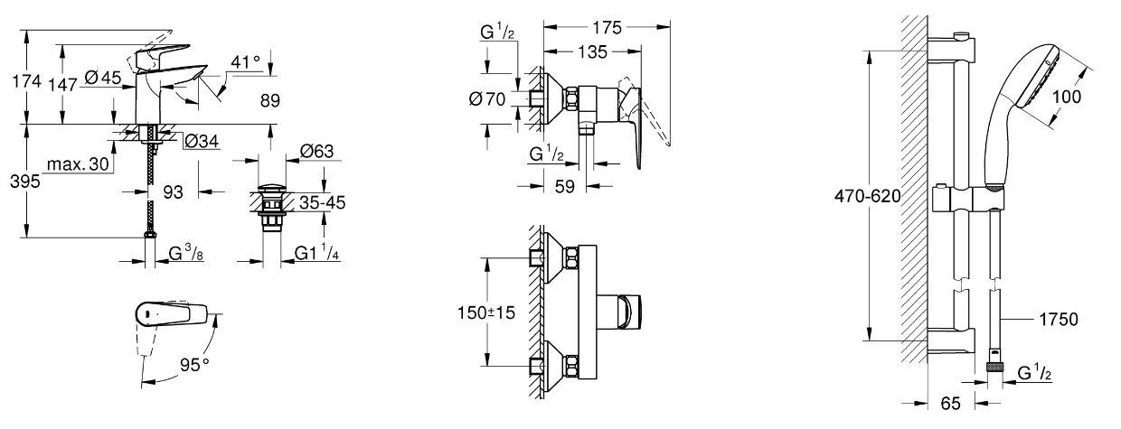 | Комплектация | Смеситель для раковины S-размера Grohe QuickFix Start Edge ColdStart 23900001. Смеситель для душа Grohe QuickFix Start Edge 24197001. Душевый гарнитур со штангой, 1 режим струи Grohe QuickFix Vitalio Start 27942000 |