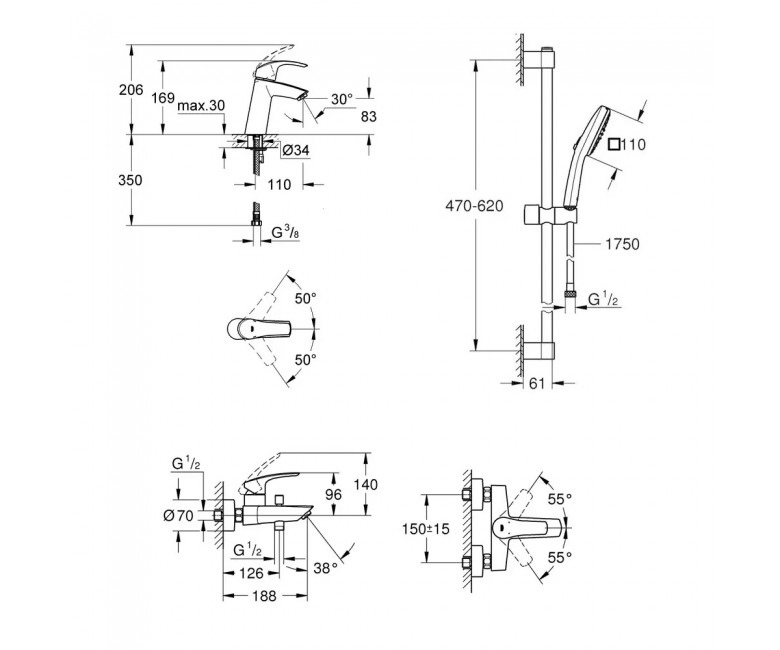 | Комплектация | смеситель для умывальника, смеситель для ванны, ручной душ, душевая штанга, душевой шланг |
