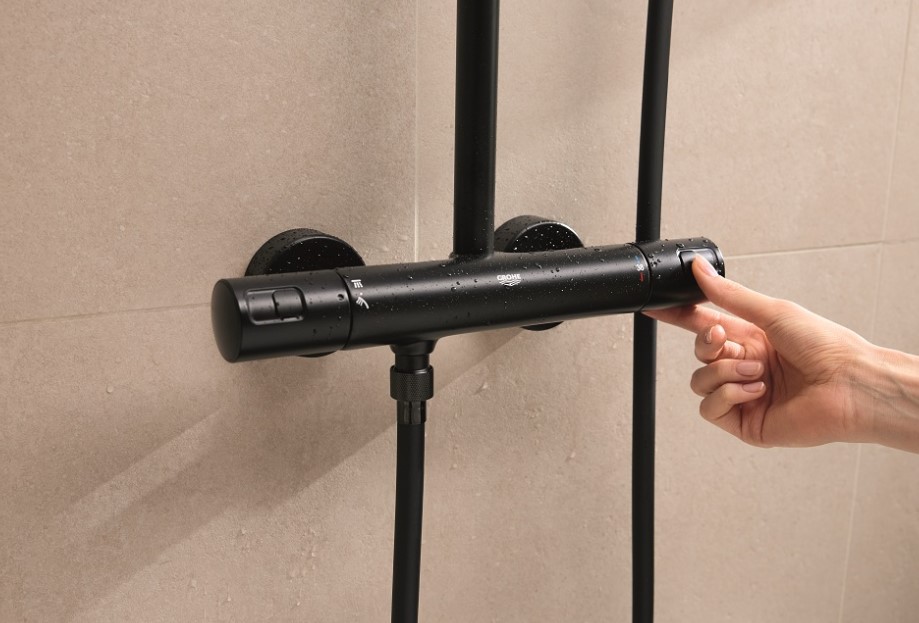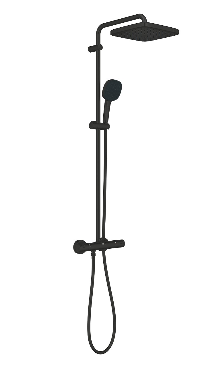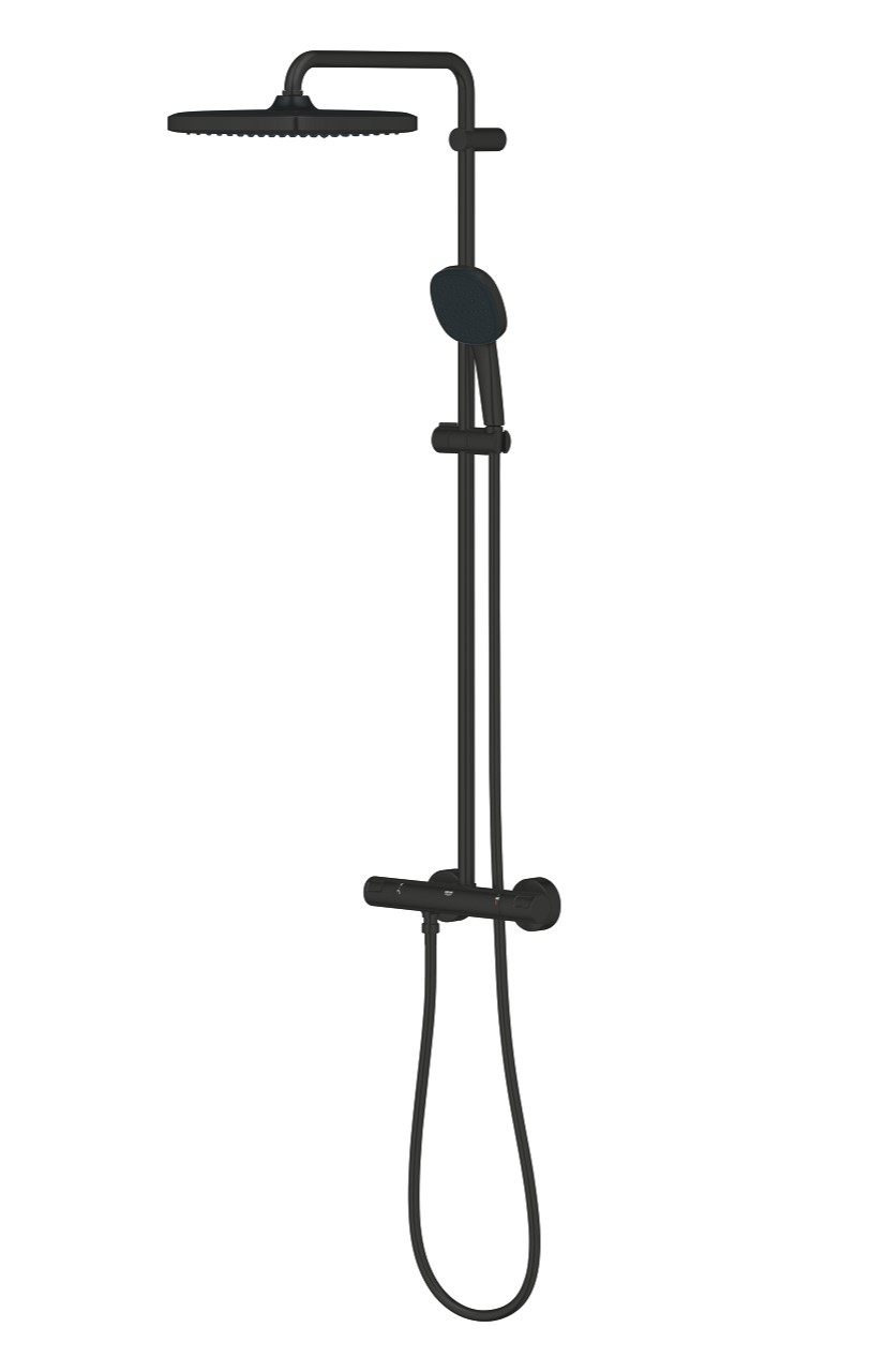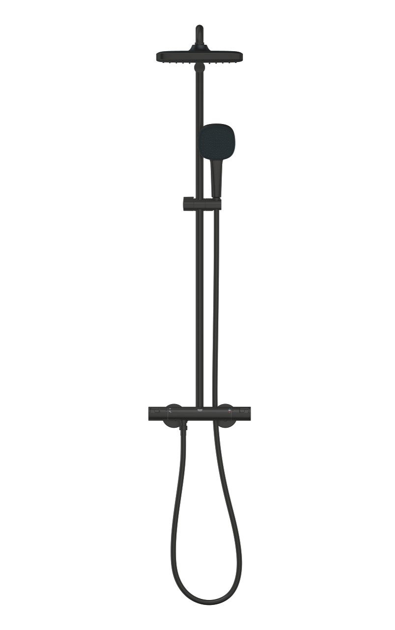 Душевая система GROHE Vitalio Comfort 250 матового черного цвета сочетает в себе стиль, удобство использования и экологичность, а также преимущества новейшей термостатической технологии. Душевая лейка обеспечивает мягкий, расслабляющий дождевой режим. Ручной душ оснащен ударопрочным силиконовым кольцом для защиты от падений и ударов. Режимы ручного душа легко переключаются с помощью инновационного переключателя GROHE SmartSwitch на задней части душевой лейки. Технология GROHE DreamSpray обеспечивает равномерный поток из каждой форсунки SpeedClean с антиизвестковым покрытием, которые можно очистить простым движением пальца.