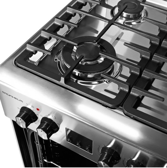 Плита газоэлектрическая Grunhelm FD66234I – модель комплектуется функцией контроля газа, поэтому использование этой модели будет максимально безопасным и комфортным. На варочной панели предусмотрены 4 инновационные конфорки разных размеров – для комфортного и равномерного нагрева посуды разных объемов и диаметров днища. Мощность газового потока и пламени регулируют поворотные ручки на передней панели плиты.