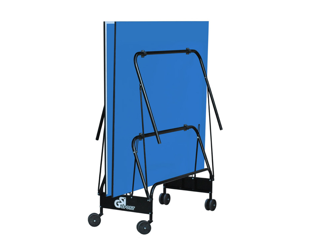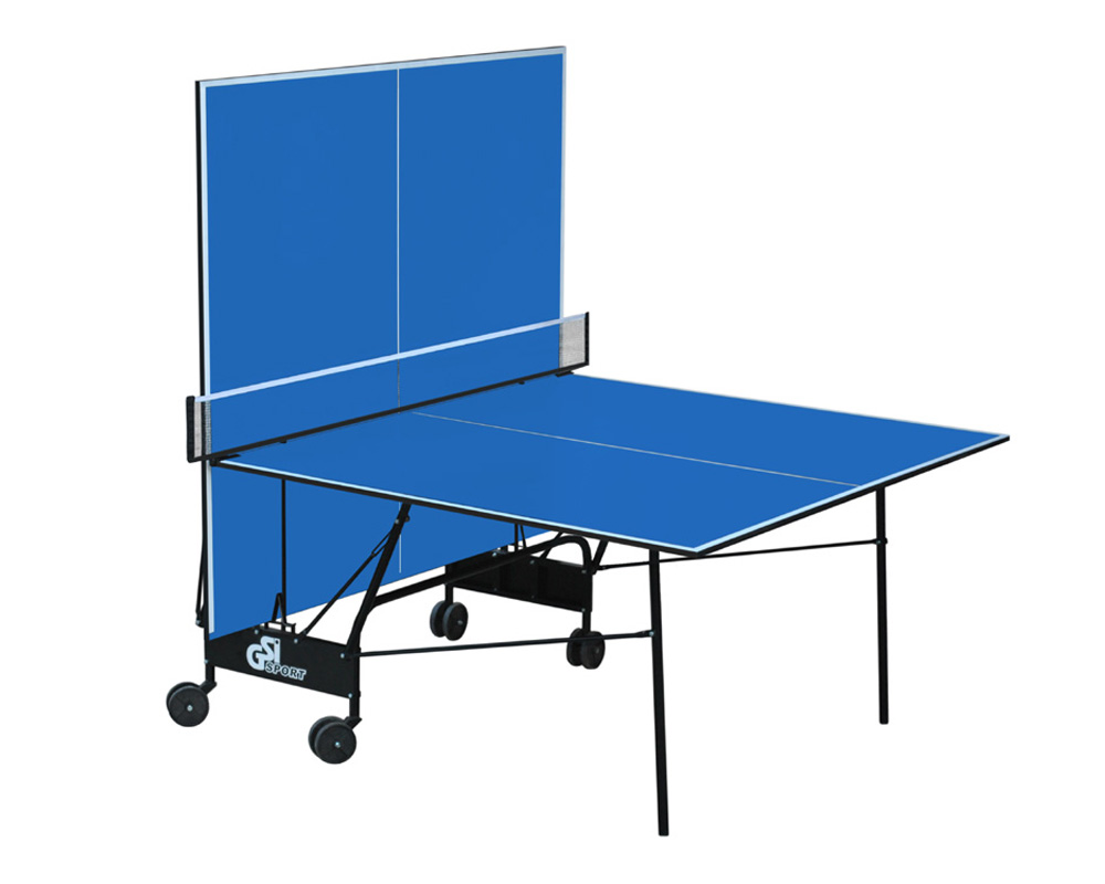 Теннисный стол для закрытых помещений. В качестве материала для игровой поверхности используется специально обработанная древесностружечная плита (ДСП) толщиной 16 мм. На ДСП нанесено специальное антибликовое пластиковое покрытие синего цвета. Теннисный стол базируется на компактной удобной тележке, изготовленной из металлического трубчатого профиля диаметром 25 мм с полиэфирным покрытием. Конструкция стола позволяет тренироваться в одиночку. Стол легко перемещается на 4-х сдвоенных колесах диаметром 107 мм, 2 колеса маневренные. Стол комплектуется сеткой.